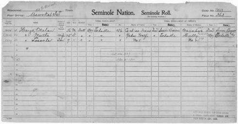 Keywords: Enrollment for Seminole Census Card 363 - NARA - 267937.tif Scope and content Name Coahsa Fixico Type Parent Sex Male City of Residence sb Name Losoche Harjo Type By Blood Age 7 Sex Female Degree Indian Blood Full Roll Number 1227 City of Residence e Name Martha Harjo Type By Blood Age 25 Sex Female Degree Indian Blood Full Roll Number 1226 City of Residence e Name Okchan Harjo Type By Blood Age 56 Sex Male Degree Indian Blood Full Roll Number 1225 City of Residence e Name Hully Type Parent Sex Female City of Residence e Name Wanahye Type Parent Sex Female City of Residence sb Name Yaha Wolf Type Parent Sex Male City of Residence e General notes 267937 Local identifier 75-53A-SEMINOLE 363 Department of the Interior Office of Indian Affairs Office of the Commissioner to the Five Civilized Tribes 1893 - 1914 NARA's Southwest Region Fort Worth NRFA 1400 John Burgess Drive Fort Worth TX 76140 Record group Record Group 75 Records of the Bureau of Indian Affairs 1793 - 1999 Record group ARC 404 Enrollment Cards compiled 1898 - 1914 Series ARC 251747 File unit File unit ARC Variant control numbers NAIL Control Number NRFF-75-53A-31858<br /> NAIL Control Number NRFF-75-53A-34624<br /> NAIL Control Number NRFF-75-53A-34705<br /> NAIL Control Number NRFF-75-53A-34897<br /> NAIL Control Number NRFF-75-53A-36901<br /> NAIL Control Number NRFF-75-53A-50584<br /> NAIL Control Number NRFF-75-53A-51913<br /> NAIL Control Number NRFF-75-53A-SEMINOLE 363 yes Other versions <gallery> File Enrollment_for_Seminole_Census_Card_363_-_NARA_-_267937 tif tif File Enrollment_for_Seminole_Census_Card_363_-_NARA_-_267937 jpg jpg </gallery> NARA-cooperation PD-USGov Seminole census cards NARA TIF images with categorized JPGs |