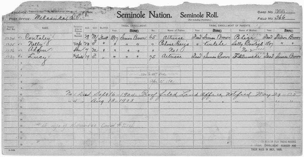 Keywords: Enrollment for Seminole Census Card 366 - NARA - 267940.jpg Scope and content Name Adam Type By Blood Age 7 Sex Male Degree Indian Blood Full Roll Number 1236 City of Residence sb Name Artusse Type Parent Sex Male City of Residence sb Name Sally Bowlegs Type Parent Sex Female City of Residence sb Name Contaley Type By Blood Age 28 Sex Male Degree Indian Blood Full Roll Number 1234 City of Residence sb Name Fiklumeke Type Parent Sex Female City of Residence sb Name Pahose Harjo Type Parent Sex Male City of Residence k Name Lucy Type By Blood Age 19 Sex Female Degree Indian Blood Full Roll Number 1237 City of Residence sb Name Nelly Type By Blood Age 20 Sex Female Degree Indian Blood Full Roll Number 1235 City of Residence sb Name Pohige Type Parent Sex Female City of Residence sb General notes 267940 Local identifier 75-53A-SEMINOLE 366 Department of the Interior Office of Indian Affairs Office of the Commissioner to the Five Civilized Tribes 1893 - 1914 NARA's Southwest Region Fort Worth NRFA 1400 John Burgess Drive Fort Worth TX 76140 Record group Record Group 75 Records of the Bureau of Indian Affairs 1793 - 1999 Record group ARC 404 Enrollment Cards compiled 1898 - 1914 Series ARC 251747 File unit File unit ARC Variant control numbers NAIL Control Number NRFF-75-53A-22675<br /> NAIL Control Number NRFF-75-53A-23404<br /> NAIL Control Number NRFF-75-53A-25523<br /> NAIL Control Number NRFF-75-53A-28720<br /> NAIL Control Number NRFF-75-53A-31566<br /> NAIL Control Number NRFF-75-53A-34936<br /> NAIL Control Number NRFF-75-53A-40173<br /> NAIL Control Number NRFF-75-53A-43045<br /> NAIL Control Number NRFF-75-53A-44254<br /> NAIL Control Number NRFF-75-53A-SEMINOLE 366 Other versions <gallery> File Enrollment_for_Seminole_Census_Card_366_-_NARA_-_267940 tif tif File Enrollment_for_Seminole_Census_Card_366_-_NARA_-_267940 jpg jpg </gallery> NARA-cooperation PD-USGov Seminole census cards |