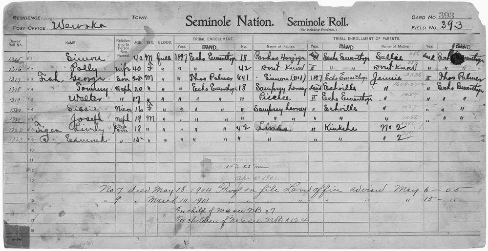 | Keywords: Enrollment for Seminole Census Card 393 - NARA - 267967.tif Scope and content Name Edward Type By Blood Age 15 Sex Male Degree Indian Blood Full Roll Number 1323 City of Residence ee Name George Fish Type By Blood Age 25 Sex Male Degree Indian Blood Full Roll Number 1317 City of Residence tp Name Parhos Harjoge Type Parent Sex Male City of Residence ee Name Joseph Type By Blood Age 19 Sex Male Degree Indian Blood Full Roll Number 1321 City of Residence ee Name Sampsey Larney Type Parent Sex Male City of Residence e Name Pischee Type Parent Sex Male City of Residence ee Name Polly Type By Blood Age 40 Sex Female Degree Indian Blood Full Roll Number 1316 City of Residence ee Name Simon Type By Blood Age 40 Sex Male Degree Indian Blood Full Roll Number 1315 City of Residence ee Name Sissie Type By Blood Age 16 Sex Female Degree Indian Blood Full Roll Number 1320 City of Residence ee Name Lively Tiger Type By Blood Age 18 Sex Male Degree Indian Blood Full Roll Number 1322 City of Residence ee Name Tommy Type By Blood Age 20 Sex Male Degree Indian Blood Full Roll Number 1318 City of Residence ee Name Wlater Type By Blood Age 17 Sex Male Degree Indian Blood Full Roll Number 1319 City of Residence ee General notes 267967 Local identifier 75-53A-SEMINOLE 393 Department of the Interior Office of Indian Affairs Office of the Commissioner to the Five Civilized Tribes 1893 - 1914 NARA's Southwest Region Fort Worth NRFA 1400 John Burgess Drive Fort Worth TX 76140 Record group Record Group 75 Records of the Bureau of Indian Affairs 1793 - 1999 Record group ARC 404 Enrollment Cards compiled 1898 - 1914 Series ARC 251747 File unit File unit ARC Variant control numbers NAIL Control Number NRFF-75-53A-30777<br /> NAIL Control Number NRFF-75-53A-31619<br /> NAIL Control Number NRFF-75-53A-35446<br /> NAIL Control Number NRFF-75-53A-38161<br /> NAIL Control Number NRFF-75-53A-39059<br /> NAIL Control Number NRFF-75-53A-44194<br /> NAIL Control Number NRFF-75-53A-44315<br /> NAIL Control Number NRFF-75-53A-46996<br /> NAIL Control Number NRFF-75-53A-47111<br /> NAIL Control Number NRFF-75-53A-49614<br /> NAIL Control Number NRFF-75-53A-50022<br /> NAIL Control Number NRFF-75-53A-51805<br /> NAIL Control Number NRFF-75-53A-SEMINOLE 393 yes Other versions <gallery> File Enrollment_for_Seminole_Census_Card_393_-_NARA_-_267967 tif tif File Enrollment_for_Seminole_Census_Card_393_-_NARA_-_267967 jpg jpg </gallery> NARA-cooperation PD-USGov Seminole census cards NARA TIF images with categorized JPGs |