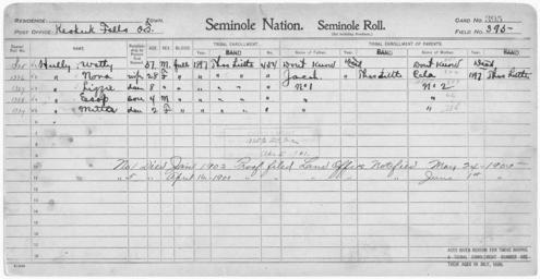 Keywords: Enrollment for Seminole Census Card 395 - NARA - 267969.tif Scope and content Name Esop Hully Type By Blood Age 4 Sex Male Degree Indian Blood Full Roll Number 1328 City of Residence tl Name Lizzie Hully Type By Blood Age 8 Sex Female Degree Indian Blood Full Roll Number 1327 City of Residence tl Name Mitta Hully Type By Blood Age 12 Sex Female Degree Indian Blood Full Roll Number 1329 City of Residence tl Name Nora Hully Type By Blood Age 28 Sex Female Degree Indian Blood Full Roll Number 1326 City of Residence tl Name Watty Hully Type By Blood Age 37 Sex Male Degree Indian Blood Full Roll Number 1325 City of Residence tl General notes 267969 Local identifier 75-53A-SEMINOLE 395 Department of the Interior Office of Indian Affairs Office of the Commissioner to the Five Civilized Tribes 1893 - 1914 NARA's Southwest Region Fort Worth NRFA 1400 John Burgess Drive Fort Worth TX 76140 Record group Record Group 75 Records of the Bureau of Indian Affairs 1793 - 1999 Record group ARC 404 Enrollment Cards compiled 1898 - 1914 Series ARC 251747 File unit File unit ARC Variant control numbers NAIL Control Number NRFF-75-53A-36908<br /> NAIL Control Number NRFF-75-53A-36913<br /> NAIL Control Number NRFF-75-53A-36915<br /> NAIL Control Number NRFF-75-53A-36916<br /> NAIL Control Number NRFF-75-53A-36920<br /> NAIL Control Number NRFF-75-53A-SEMINOLE 395 yes Other versions <gallery> File Enrollment_for_Seminole_Census_Card_395_-_NARA_-_267969 tif tif File Enrollment_for_Seminole_Census_Card_395_-_NARA_-_267969 jpg jpg </gallery> NARA-cooperation PD-USGov Seminole census cards NARA TIF images with categorized JPGs |
