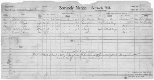 Keywords: Enrollment for Seminole Census Card 412 - NARA - 267986.jpg Scope and content Name Cowake Type Parent Sex Male City of Residence th Name Anna Davis Type By Blood Age 1 Sex Female Degree Indian Blood Full Roll Number 1371 City of Residence sb Name Jim Davis Type By Blood Age 25 Sex Male Degree Indian Blood Full Roll Number 1367 City of Residence sb Name Jim Davis Type Parent Sex Male City of Residence sb Name Lilly Davis Type By Blood Age 1 Sex Female Degree Indian Blood Full Roll Number 1369 City of Residence sb Name Rhoda Davis Type By Blood Age 23 Sex Female Degree Indian Blood Full Roll Number 1368 City of Residence sb Name Marty Type Parent Sex Male City of Residence nh Name Passake Type Parent Sex Female City of Residence sb Name Davis Yahola Type By Blood Age 8 Sex Male Degree Indian Blood Full Roll Number 1370 City of Residence sb General notes 267986 Local identifier 75-53A-SEMINOLE 412 Department of the Interior Office of Indian Affairs Office of the Commissioner to the Five Civilized Tribes 1893 - 1914 NARA's Southwest Region Fort Worth NRFA 1400 John Burgess Drive Fort Worth TX 76140 Record group Record Group 75 Records of the Bureau of Indian Affairs 1793 - 1999 Record group ARC 404 Enrollment Cards compiled 1898 - 1914 Series ARC 251747 File unit File unit ARC Variant control numbers NAIL Control Number NRFF-75-53A-28989<br /> NAIL Control Number NRFF-75-53A-29564<br /> NAIL Control Number NRFF-75-53A-29760<br /> NAIL Control Number NRFF-75-53A-29761<br /> NAIL Control Number NRFF-75-53A-29826<br /> NAIL Control Number NRFF-75-53A-29922<br /> NAIL Control Number NRFF-75-53A-40789<br /> NAIL Control Number NRFF-75-53A-43661<br /> NAIL Control Number NRFF-75-53A-52107<br /> NAIL Control Number NRFF-75-53A-SEMINOLE 412 Other versions <gallery> File Enrollment_for_Seminole_Census_Card_412_-_NARA_-_267986 tif tif File Enrollment_for_Seminole_Census_Card_412_-_NARA_-_267986 jpg jpg </gallery> NARA-cooperation PD-USGov Seminole census cards |