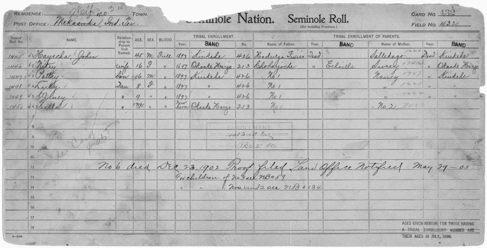 | Keywords: Enrollment for Seminole Census Card 432 - NARA - 268006.jpg Scope and content Name Choharjoche Type Parent Sex Male City of Residence e Name Hodulga Fixico Type Parent Sex Male Name John Hayecha Type By Blood Age 45 Sex Male Degree Indian Blood Full Roll Number 1445 City of Residence k Name Lucy Type By Blood Age 8 Sex Female Degree Indian Blood Full Roll Number 1448 City of Residence k Name Nitey Type By Blood Age 16 Sex Female Degree Indian Blood Full Roll Number 1446 City of Residence oh Name Pottey Type By Blood Age 16 Sex Male Degree Indian Blood Full Roll Number 1447 City of Residence k Name Salledago Type Parent Sex Female City of Residence k Name Susey Type Parent Sex Female City of Residence oh Name Tulla Type By Blood Age 1 Sex Female Degree Indian Blood Full Roll Number 1450 City of Residence oh Name Winey Type By Blood Age 9 Sex Female Degree Indian Blood Full Roll Number 1449 City of Residence k General notes 268006 Local identifier 75-53A-SEMINOLE 432 Department of the Interior Office of Indian Affairs Office of the Commissioner to the Five Civilized Tribes 1893 - 1914 NARA's Southwest Region Fort Worth NRFA 1400 John Burgess Drive Fort Worth TX 76140 Record group Record Group 75 Records of the Bureau of Indian Affairs 1793 - 1999 Record group ARC 404 Enrollment Cards compiled 1898 - 1914 Series ARC 251747 File unit File unit ARC Variant control numbers NAIL Control Number NRFF-75-53A-27979<br /> NAIL Control Number NRFF-75-53A-31916<br /> NAIL Control Number NRFF-75-53A-35880<br /> NAIL Control Number NRFF-75-53A-40176<br /> NAIL Control Number NRFF-75-53A-43185<br /> NAIL Control Number NRFF-75-53A-44597<br /> NAIL Control Number NRFF-75-53A-45600<br /> NAIL Control Number NRFF-75-53A-48415<br /> NAIL Control Number NRFF-75-53A-50110<br /> NAIL Control Number NRFF-75-53A-51696<br /> NAIL Control Number NRFF-75-53A-SEMINOLE 432 Other versions <gallery> File Enrollment_for_Seminole_Census_Card_432_-_NARA_-_268006 tif tif File Enrollment_for_Seminole_Census_Card_432_-_NARA_-_268006 jpg jpg </gallery> NARA-cooperation PD-USGov Seminole census cards |