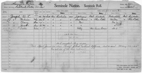MAKE A MEME View Large Image Enrollment for Seminole Census Card 445 - NARA - 268019.tif Scope and content Name Holochetse Type Parent Sex Female City of Residence k Name Jophega Type Parent Sex Male City of Residence k Name Jacob Joseph Type By Blood Age 16 Sex Male ...