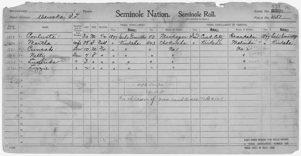 | Keywords: Enrollment for Seminole Census Card 451 - NARA - 268025.tif Scope and content Name Chokoche Type Parent Sex Male City of Residence k Name Cunsah Type By Blood Age 10 Sex Male Degree Indian Blood 3/4 Roll Number 1521 City of Residence k Name Hesahaku Type Parent Sex Female City of Residence ee Name Lizzie Type By Blood Age 2 Sex Female Degree Indian Blood 3/4 Roll Number 1524 City of Residence k Name Lucinda Type By Blood Age 3 Sex Female Degree Indian Blood 3/4 Roll Number 1523 City of Residence k Name Malinda Type Parent Sex Female City of Residence k Name Martha Type By Blood Age 28 Sex Female Degree Indian Blood Full Roll Number 1520 City of Residence k Name Muskogee Type Parent Sex Male City of Residence Creek Name Nelly Type By Blood Age 7 Sex Female Degree Indian Blood 3/4 Roll Number 1522 City of Residence k Name Ponluste Type By Blood Age 30 Sex Male Degree Indian Blood 1/2 Roll Number 1519 City of Residence ee General notes 268025 Local identifier 75-53A-SEMINOLE 451 Department of the Interior Office of Indian Affairs Office of the Commissioner to the Five Civilized Tribes 1893 - 1914 NARA's Southwest Region Fort Worth NRFA 1400 John Burgess Drive Fort Worth TX 76140 Record group Record Group 75 Records of the Bureau of Indian Affairs 1793 - 1999 Record group ARC 404 Enrollment Cards compiled 1898 - 1914 Series ARC 251747 File unit File unit ARC Variant control numbers NAIL Control Number NRFF-75-53A-27986<br /> NAIL Control Number NRFF-75-53A-29396<br /> NAIL Control Number NRFF-75-53A-36154<br /> NAIL Control Number NRFF-75-53A-39658<br /> NAIL Control Number NRFF-75-53A-40125<br /> NAIL Control Number NRFF-75-53A-40338<br /> NAIL Control Number NRFF-75-53A-40738<br /> NAIL Control Number NRFF-75-53A-42866<br /> NAIL Control Number NRFF-75-53A-43046<br /> NAIL Control Number NRFF-75-53A-44357<br /> NAIL Control Number NRFF-75-53A-SEMINOLE 451 yes Other versions <gallery> File Enrollment_for_Seminole_Census_Card_451_-_NARA_-_268025 tif tif File Enrollment_for_Seminole_Census_Card_451_-_NARA_-_268025 jpg jpg </gallery> NARA-cooperation PD-USGov Seminole census cards NARA TIF images with categorized JPGs |