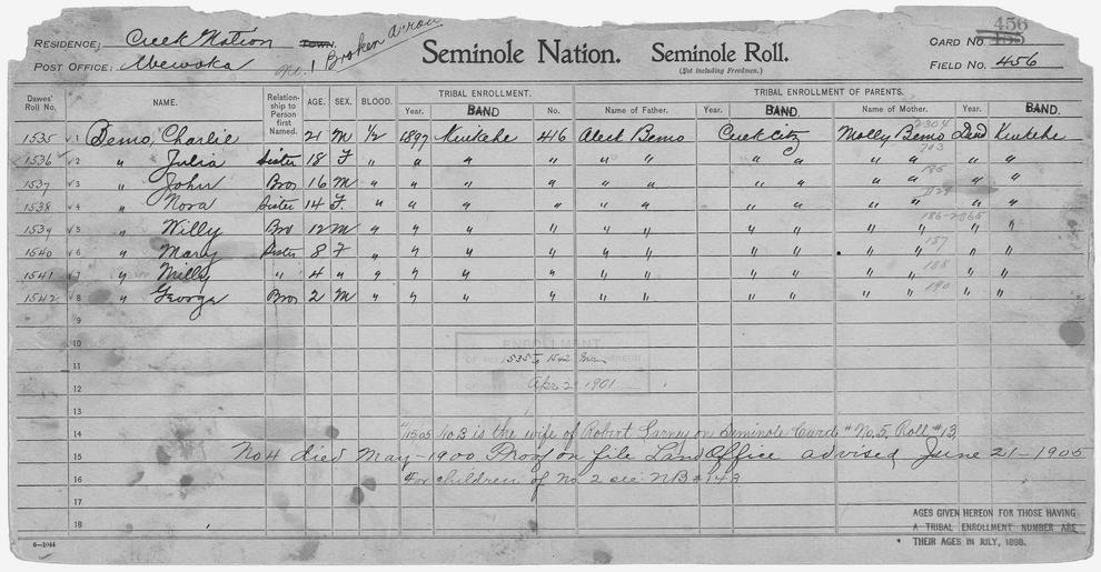 | Keywords: Enrollment for Seminole Census Card 456 - NARA - 268030.tif Scope and content Name Aleck Bemo Type Parent Sex Male City of Residence Creek Name Charlie Bemo Type By Blood Age 21 Sex Male Degree Indian Blood 1/2 Roll Number 1535 City of Residence k Name George Bemo Type By Blood Age 2 Sex Male Degree Indian Blood 1/2 Roll Number 1542 City of Residence k Name John Bemo Type By Blood Age 16 Sex Male Degree Indian Blood Full Roll Number 1537 City of Residence k Name Julia Bemo Type By Blood Age 18 Sex Female Degree Indian Blood 1/2 Roll Number 1536 City of Residence k Name Mary Bemo Type By Blood Age 8 Sex Female Degree Indian Blood 1/2 Roll Number 1540 City of Residence k Name Milly Bemo Type By Blood Age 4 Sex Female Degree Indian Blood 1/2 Roll Number 1541 City of Residence k Name Molly Bemo Type Parent Sex Female City of Residence k Name Nora Bemo Type By Blood Age 14 Sex Female Degree Indian Blood 1/2 Roll Number 1538 City of Residence k Name Willy Bemo Type By Blood Age 12 Sex Male Degree Indian Blood 1/2 Roll Number 1539 City of Residence k General notes 268030 Local identifier 75-53A-SEMINOLE 456 Department of the Interior Office of Indian Affairs Office of the Commissioner to the Five Civilized Tribes 1893 - 1914 NARA's Southwest Region Fort Worth NRFA 1400 John Burgess Drive Fort Worth TX 76140 Record group Record Group 75 Records of the Bureau of Indian Affairs 1793 - 1999 Record group ARC 404 Enrollment Cards compiled 1898 - 1914 Series ARC 251747 File unit File unit ARC Variant control numbers NAIL Control Number NRFF-75-53A-24554<br /> NAIL Control Number NRFF-75-53A-24556<br /> NAIL Control Number NRFF-75-53A-24558<br /> NAIL Control Number NRFF-75-53A-24560<br /> NAIL Control Number NRFF-75-53A-24561<br /> NAIL Control Number NRFF-75-53A-24564<br /> NAIL Control Number NRFF-75-53A-24565<br /> NAIL Control Number NRFF-75-53A-24566<br /> NAIL Control Number NRFF-75-53A-24568<br /> NAIL Control Number NRFF-75-53A-24569<br /> NAIL Control Number NRFF-75-53A-SEMINOLE 456 yes Other versions <gallery> File Enrollment_for_Seminole_Census_Card_456_-_NARA_-_268030 tif tif File Enrollment_for_Seminole_Census_Card_456_-_NARA_-_268030 jpg jpg </gallery> NARA-cooperation PD-USGov Seminole census cards NARA TIF images with categorized JPGs |