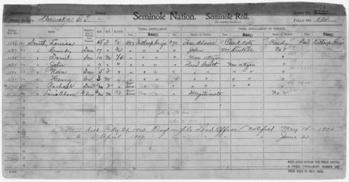 | Keywords: Enrollment for Seminole Census Card 474 - NARA - 268048.tif Scope and content Name Tom Adams Type Parent Sex Male City of Residence Creek Name Cindy Type Parent Sex Female City of Residence nh Name Cindy Smith Type By Blood Age 17 Sex Female Degree Indian Blood 3/4 Roll Number 1587 City of Residence nh Name Daniel Smith Type By Blood Age 10 Sex Male Degree Indian Blood 1/4 Roll Number 1588 City of Residence nh Name Fred Smith Type Parent Sex Male Name Henry Smith Type By Blood Age 3 Sex Male Degree Indian Blood 1/4 Roll Number 1591 City of Residence nh Name John Smith Type By Blood Age 7 Sex Male Degree Indian Blood 1/4 Roll Number 1589 City of Residence nh Name Louis Adam Smith Type By Blood Age 1 Sex Male Degree Indian Blood 3/8 Roll Number 1593 City of Residence nh Name Louisa Smith Type By Blood Age 45 Sex Female Degree Indian Blood 1/2 Roll Number 1586 City of Residence nh Name Nora Smith Type By Blood Age 5 Sex Female Degree Indian Blood 1/4 Roll Number 1590 City of Residence nh Name Rachael Smith Type By Blood Age 1 Sex Female Degree Indian Blood 1/4 Roll Number 1592 City of Residence nh General notes 268048 Local identifier 75-53A-SEMINOLE 474 Department of the Interior Office of Indian Affairs Office of the Commissioner to the Five Civilized Tribes 1893 - 1914 NARA's Southwest Region Fort Worth NRFA 1400 John Burgess Drive Fort Worth TX 76140 Record group Record Group 75 Records of the Bureau of Indian Affairs 1793 - 1999 Record group ARC 404 Enrollment Cards compiled 1898 - 1914 Series ARC 251747 File unit File unit ARC Variant control numbers NAIL Control Number NRFF-75-53A-22752<br /> NAIL Control Number NRFF-75-53A-28237<br /> NAIL Control Number NRFF-75-53A-47205<br /> NAIL Control Number NRFF-75-53A-47208<br /> NAIL Control Number NRFF-75-53A-47238<br /> NAIL Control Number NRFF-75-53A-47257<br /> NAIL Control Number NRFF-75-53A-47288<br /> NAIL Control Number NRFF-75-53A-47319<br /> NAIL Control Number NRFF-75-53A-47325<br /> NAIL Control Number NRFF-75-53A-47388<br /> NAIL Control Number NRFF-75-53A-47395<br /> NAIL Control Number NRFF-75-53A-SEMINOLE 474 yes Other versions <gallery> File Enrollment_for_Seminole_Census_Card_474_-_NARA_-_268048 tif tif File Enrollment_for_Seminole_Census_Card_474_-_NARA_-_268048 jpg jpg </gallery> NARA-cooperation PD-USGov Seminole census cards NARA TIF images with categorized JPGs |