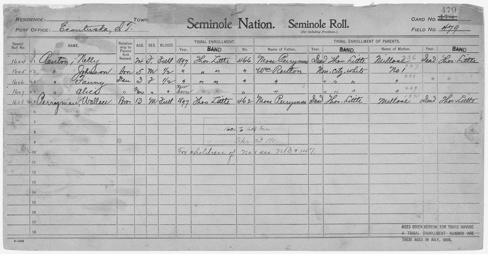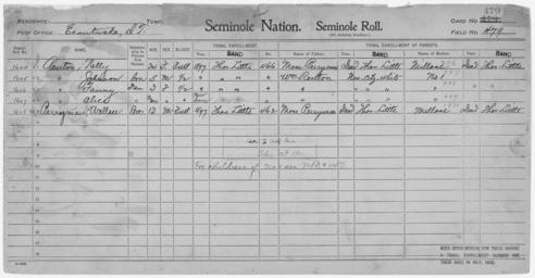 Keywords: Enrollment for Seminole Census Card 479 - NARA - 268053.tif Scope and content Name Millose Type Parent Sex Female City of Residence tl Name Mose Perryman Type Parent Sex Male City of Residence tl Name Wallace Perryman Type By Blood Age 13 Sex Male Degree Indian Blood Full Roll Number 1608 City of Residence tl Name Alice Renton Type By Blood Age 1 Sex Female Degree Indian Blood 1/2 Roll Number 1607 City of Residence tl Name Fanny Renton Type By Blood Age 3 Sex Female Degree Indian Blood 1/2 Roll Number 1606 City of Residence tl Name Johnson Renton Type By Blood Age 5 Sex Male Degree Indian Blood 1/2 Roll Number 1605 City of Residence tl Name Nelly Renton Type By Blood Age 24 Sex Female Degree Indian Blood Full Roll Number 1604 City of Residence tl Name William Renton Type Parent Sex Male General notes 268053 Local identifier 75-53A-SEMINOLE 479 Department of the Interior Office of Indian Affairs Office of the Commissioner to the Five Civilized Tribes 1893 - 1914 NARA's Southwest Region Fort Worth NRFA 1400 John Burgess Drive Fort Worth TX 76140 Record group Record Group 75 Records of the Bureau of Indian Affairs 1793 - 1999 Record group ARC 404 Enrollment Cards compiled 1898 - 1914 Series ARC 251747 File unit File unit ARC Variant control numbers NAIL Control Number NRFF-75-53A-42171<br /> NAIL Control Number NRFF-75-53A-43927<br /> NAIL Control Number NRFF-75-53A-43990<br /> NAIL Control Number NRFF-75-53A-44935<br /> NAIL Control Number NRFF-75-53A-44936<br /> NAIL Control Number NRFF-75-53A-44937<br /> NAIL Control Number NRFF-75-53A-44938<br /> NAIL Control Number NRFF-75-53A-44939<br /> NAIL Control Number NRFF-75-53A-SEMINOLE 479 yes Other versions <gallery> File Enrollment_for_Seminole_Census_Card_479_-_NARA_-_268053 tif tif File Enrollment_for_Seminole_Census_Card_479_-_NARA_-_268053 jpg jpg </gallery> NARA-cooperation PD-USGov Seminole census cards NARA TIF images with categorized JPGs |