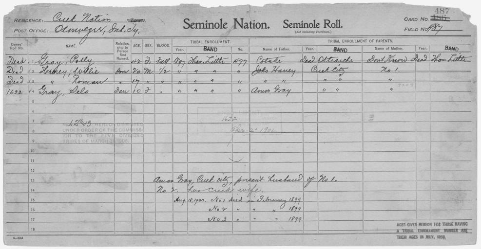Keywords: Enrollment for Seminole Census Card 487 - NARA - 268061.jpg Scope and content Name Cotske Type Parent Sex Male City of Residence o Name Amos Gray Type Parent Sex Male City of Residence Creek Name Polly Gray Type By Blood Age 42 Sex Female Degree Indian Blood Full City of Residence tl Name Selo Gray Type By Blood Age 10 Sex Female Degree Indian Blood 1/2 Roll Number 1622 City of Residence tl Name Joko Haney Type Parent Sex Male City of Residence Creek Name Roman Haney Type By Blood Age 17 Sex Male Degree Indian Blood 1/2 City of Residence tl Name Willie Haney Type By Blood Age 20 Sex Male Degree Indian Blood 1/2 City of Residence tl General notes 268061 Local identifier 75-53A-SEMINOLE 487 Department of the Interior Office of Indian Affairs Office of the Commissioner to the Five Civilized Tribes 1893 - 1914 NARA's Southwest Region Fort Worth NRFA 1400 John Burgess Drive Fort Worth TX 76140 Record group Record Group 75 Records of the Bureau of Indian Affairs 1793 - 1999 Record group ARC 404 Enrollment Cards compiled 1898 - 1914 Series ARC 251747 File unit File unit ARC Variant control numbers NAIL Control Number NRFF-75-53A-28968<br /> NAIL Control Number NRFF-75-53A-33179<br /> NAIL Control Number NRFF-75-53A-33245<br /> NAIL Control Number NRFF-75-53A-33248<br /> NAIL Control Number NRFF-75-53A-33934<br /> NAIL Control Number NRFF-75-53A-33945<br /> NAIL Control Number NRFF-75-53A-33951<br /> NAIL Control Number NRFF-75-53A-SEMINOLE 487 Other versions <gallery> File Enrollment_for_Seminole_Census_Card_487_-_NARA_-_268061 tif tif File Enrollment_for_Seminole_Census_Card_487_-_NARA_-_268061 jpg jpg </gallery> NARA-cooperation PD-USGov Seminole census cards |