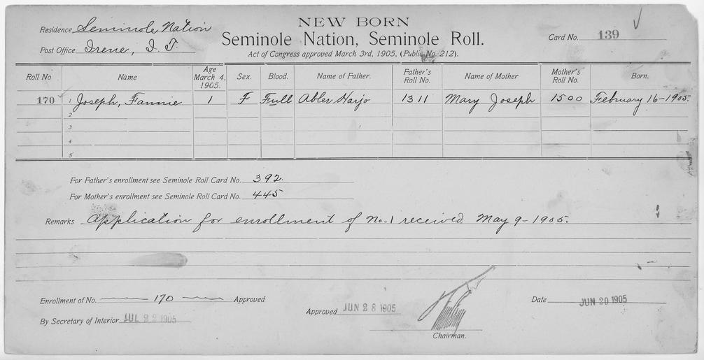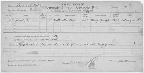 | Keywords: Enrollment for Seminole Census Card 139 - NARA - 267713.tif Scope and content Name Cartcher Fege Type Parent Sex Male City of Residence tp Name Jacksee Type Parent Sex Male Name Judy Type By Blood Age 42 Sex Female Degree Indian Blood Full Roll Number 476 City of Residence th Name Mesale Type By Blood Age 12 Sex Female Degree Indian Blood Full Roll Number 480 City of Residence th Name Missena Type By Blood Age 10 Sex Female Degree Indian Blood Full Roll Number 481 City of Residence th Name Mosar Type By Blood Age 17 Sex Male Degree Indian Blood Full Roll Number 477 City of Residence th Name Parney Type By Blood Age 15 Sex Male Degree Indian Blood Full Roll Number 478 City of Residence th Name Telar Type Parent Sex Male Name Tobie Type By Blood Age 13 Sex Male Degree Indian Blood Full Roll Number 479 City of Residence th Name Tuscooner Type Parent Sex Male City of Residence th Name Fannie Joseph Type Newborn Age 1 Sex Female Degree Indian Blood FULL Roll Number 170 Post Office Irene General notes 267713 Local identifier 75-53A-SEMINOLE 139 Department of the Interior Office of Indian Affairs Office of the Commissioner to the Five Civilized Tribes 1893 - 1914 NARA's Southwest Region Fort Worth NRFA 1400 John Burgess Drive Fort Worth TX 76140 Record group Record Group 75 Records of the Bureau of Indian Affairs 1793 - 1999 Record group ARC 404 Enrollment Cards compiled 1898 - 1914 Series ARC 251747 File unit File unit ARC Variant control numbers NAIL Control Number NRFF-75-53A-31359<br /> NAIL Control Number NRFF-75-53A-37270<br /> NAIL Control Number NRFF-75-53A-38196<br /> NAIL Control Number NRFF-75-53A-41800<br /> NAIL Control Number NRFF-75-53A-42268<br /> NAIL Control Number NRFF-75-53A-42710<br /> NAIL Control Number NRFF-75-53A-43591<br /> NAIL Control Number NRFF-75-53A-48852<br /> NAIL Control Number NRFF-75-53A-49961<br /> NAIL Control Number NRFF-75-53A-50194<br /> NAIL Control Number NRFF-75-53A-52723<br /> NAIL Control Number NRFF-75-53A-SEMINOLE 139 yes Other versions <gallery> File Enrollment_for_Seminole_Census_Card_139_-_NARA_-_267713 tif tif File Enrollment_for_Seminole_Census_Card_139_-_NARA_-_267713 jpg jpg </gallery> NARA-cooperation PD-USGov Cherokee census cards NARA TIF images with categorized JPGs |