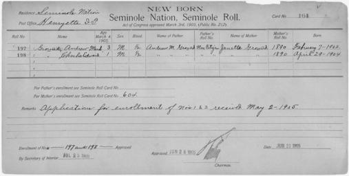 | Keywords: Enrollment for Seminole Census Card 164 - NARA - 267738.tif Scope and content Name Joanna Brown Type By Blood Age 3 Sex Female Degree Indian Blood Full Roll Number 586 City of Residence th Name Johnnie Brown Type Parent Sex Male City of Residence tp Name Sammy Carpitche Type By Blood Age 14 Sex Male Degree Indian Blood Full Roll Number 583 City of Residence th Name Cookogee Type Parent Sex Male City of Residence tp Name Lina Type Parent Sex Female City of Residence th Name George Pilot Type By Blood Age 8 Sex Male Degree Indian Blood 1/2 Roll Number 585 City of Residence th Name Mary Pilot Type By Blood Age 11 Sex Female Degree Indian Blood 1/2 Roll Number 585 City of Residence th Name Tolomka Type By Blood Age 30 Sex Female Degree Indian Blood Full Roll Number 582 City of Residence th Name Andrew Mark Ground Type Newborn Age 3 Sex Male Degree Indian Blood 1/2 Roll Number 197 Post Office Henryetta Name Charlie Edward Ground Type Newborn Age 1 Sex Male Degree Indian Blood 1/2 Roll Number 198 Post Office Henryetta General notes 267738 Local identifier 75-53A-SEMINOLE 164 Department of the Interior Office of Indian Affairs Office of the Commissioner to the Five Civilized Tribes 1893 - 1914 NARA's Southwest Region Fort Worth NRFA 1400 John Burgess Drive Fort Worth TX 76140 Record group Record Group 75 Records of the Bureau of Indian Affairs 1793 - 1999 Record group ARC 404 Enrollment Cards compiled 1898 - 1914 Series ARC 251747 File unit File unit ARC Variant control numbers NAIL Control Number NRFF-75-53A-25803<br /> NAIL Control Number NRFF-75-53A-25823<br /> NAIL Control Number NRFF-75-53A-27181<br /> NAIL Control Number NRFF-75-53A-28788<br /> NAIL Control Number NRFF-75-53A-39490<br /> NAIL Control Number NRFF-75-53A-44171<br /> NAIL Control Number NRFF-75-53A-44172<br /> NAIL Control Number NRFF-75-53A-50006<br /> NAIL Control Number NRFF-75-53A-52765<br /> NAIL Control Number NRFF-75-53A-52766<br /> NAIL Control Number NRFF-75-53A-SEMINOLE 164 yes Other versions <gallery> File Enrollment_for_Seminole_Census_Card_164_-_NARA_-_267738 tif tif File Enrollment_for_Seminole_Census_Card_164_-_NARA_-_267738 jpg jpg </gallery> NARA-cooperation PD-USGov Cherokee census cards NARA TIF images with categorized JPGs |