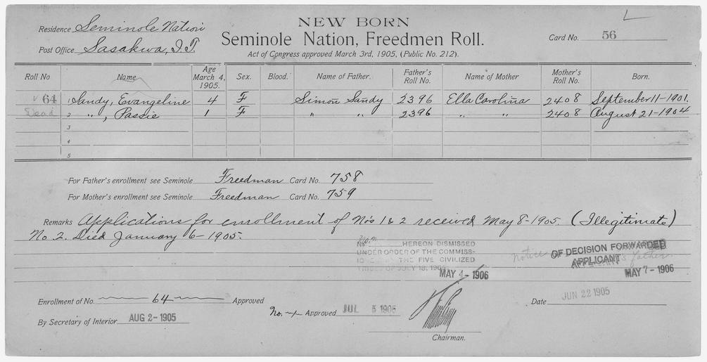 | Keywords: Enrollment for Seminole Census Card 56 - NARA - 267630.tif Scope and content Name Wesley Davis Type By Blood Age 11 Sex Female Degree Indian Blood Full Roll Number 205 City of Residence ee Name Pin Harjo Type By Blood Age 13 Sex Male Degree Indian Blood Full Roll Number 204 City of Residence ee Name Kithhoya Lewis Type By Blood Age 50 Sex Female Degree Indian Blood Full Roll Number 203 City of Residence ee Name Mulley Lewis Type By Blood Age 10 Sex Female Degree Indian Blood 3/4 City of Residence th Name Thomas Lewis Type By Blood Age 35 Sex Male Degree Indian Blood 1/2 Roll Number 202 City of Residence tp Name Loosah Type Parent Sex Female City of Residence ee Name Lucy Type By Blood Age 12 Sex Female Degree Indian Blood Full Roll Number 206 City of Residence ee Name Sinlu Type Parent Sex Female City of Residence ee Name Sokote Type Parent Sex Female City of Residence ee Name David Tulsey Type Parent Sex Male City of Residence th Name Evangeline Sandy Type Newborn Freedmen-Rejected Age 4 Sex Female Degree Indian Blood Not Reported Roll Number 64 Post Office Sasakwa Name Passie Sandy Type Newborn Freedmen-Rejected Age 1 Sex Female Degree Indian Blood Not Reported Roll Number DEAD Post Office Sasakwa General notes 267630 Local identifier 75-53A-SEMINOLE 56 Department of the Interior Office of Indian Affairs Office of the Commissioner to the Five Civilized Tribes 1893 - 1914 NARA's Southwest Region Fort Worth NRFA 1400 John Burgess Drive Fort Worth TX 76140 Record group Record Group 75 Records of the Bureau of Indian Affairs 1793 - 1999 Record group ARC 404 Enrollment Cards compiled 1898 - 1914 Series ARC 251747 File unit File unit ARC Variant control numbers NAIL Control Number NRFF-75-53A-30009<br /> NAIL Control Number NRFF-75-53A-34981<br /> NAIL Control Number NRFF-75-53A-39402<br /> NAIL Control Number NRFF-75-53A-39423<br /> NAIL Control Number NRFF-75-53A-39437<br /> NAIL Control Number NRFF-75-53A-39830<br /> NAIL Control Number NRFF-75-53A-40168<br /> NAIL Control Number NRFF-75-53A-47089<br /> NAIL Control Number NRFF-75-53A-47581<br /> NAIL Control Number NRFF-75-53A-50142<br /> NAIL Control Number NRFF-75-53A-52890<br /> NAIL Control Number NRFF-75-53A-52891<br /> NAIL Control Number NRFF-75-53A-SEMINOLE 56 yes Other versions <gallery> File Enrollment_for_Seminole_Census_Card_56_-_NARA_-_267630 tif tif File Enrollment_for_Seminole_Census_Card_56_-_NARA_-_267630 jpg jpg </gallery> NARA-cooperation PD-USGov Cherokee census cards Seminole census cards NARA TIF images with categorized JPGs |