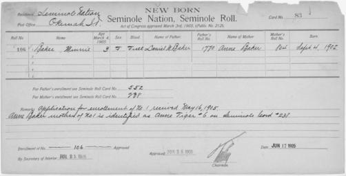 | Keywords: Enrollment for Seminole Census Card 83 - NARA - 267657.jpg Scope and content Name Ahaluk Cochutna Type Parent Sex Male City of Residence tp Name Fous Harjo Type By Blood Age 40 Sex Male Degree Indian Blood Full Roll Number 292 City of Residence tp Name Takootska Harjo Type By Blood Age 40 Sex Female Degree Indian Blood Full Roll Number 293 City of Residence tp Name Temothle Harjo Type By Blood Age 14 Sex Female Degree Indian Blood Full Roll Number 294 City of Residence tp Name Tommy Tustenuggy Type Parent Sex Male City of Residence tp Name Minnie Baker Type Newborn Age 3 Sex Female Degree Indian Blood FULL Roll Number 106 Post Office Okemah Name Leathia Ann Doser Type Newborn Freedmen-Rejected Age 1 Sex Female Degree Indian Blood Not Reported Roll Number 90 Post Office Wewoka General notes 267657 Local identifier 75-53A-SEMINOLE 83 Department of the Interior Office of Indian Affairs Office of the Commissioner to the Five Civilized Tribes 1893 - 1914 NARA's Southwest Region Fort Worth NRFA 1400 John Burgess Drive Fort Worth TX 76140 Record group Record Group 75 Records of the Bureau of Indian Affairs 1793 - 1999 Record group ARC 404 Enrollment Cards compiled 1898 - 1914 Series ARC 251747 File unit File unit ARC Variant control numbers NAIL Control Number NRFF-75-53A-28387<br /> NAIL Control Number NRFF-75-53A-34342<br /> NAIL Control Number NRFF-75-53A-35098<br /> NAIL Control Number NRFF-75-53A-35110<br /> NAIL Control Number NRFF-75-53A-50218<br /> NAIL Control Number NRFF-75-53A-52643<br /> NAIL Control Number NRFF-75-53A-52930<br /> NAIL Control Number NRFF-75-53A-SEMINOLE 83 Other versions <gallery> File Enrollment_for_Seminole_Census_Card_83_-_NARA_-_267657 tif tif File Enrollment_for_Seminole_Census_Card_83_-_NARA_-_267657 jpg jpg </gallery> NARA-cooperation PD-USGov Cherokee census cards |