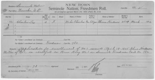 | Keywords: Enrollment for Seminole Census Card 66 - NARA - 267640.jpg Scope and content Name Carcher Chupco Type Parent Sex Male City of Residence ee Name Hagie Type Parent Sex Female City of Residence ee Name Jennie Type By Blood Age 3 Sex Female Degree Indian Blood Full Roll Number 246 City of Residence ee Name Wetley Type By Blood Age 10 Sex Male Degree Indian Blood Full Roll Number 245 City of Residence ee Name Willie Type By Blood Age 25 Sex Female Degree Indian Blood Full Roll Number 244 City of Residence ee Name Lou Charles Type Newborn Freedmen-Rejected Age 3 Sex Female Degree Indian Blood Not Reported Roll Number 73 Post Office Wewoka General notes 267640 Local identifier 75-53A-SEMINOLE 66 Department of the Interior Office of Indian Affairs Office of the Commissioner to the Five Civilized Tribes 1893 - 1914 NARA's Southwest Region Fort Worth NRFA 1400 John Burgess Drive Fort Worth TX 76140 Record group Record Group 75 Records of the Bureau of Indian Affairs 1793 - 1999 Record group ARC 404 Enrollment Cards compiled 1898 - 1914 Series ARC 251747 File unit File unit ARC Variant control numbers NAIL Control Number NRFF-75-53A-28059<br /> NAIL Control Number NRFF-75-53A-33767<br /> NAIL Control Number NRFF-75-53A-37549<br /> NAIL Control Number NRFF-75-53A-51115<br /> NAIL Control Number NRFF-75-53A-51461<br /> NAIL Control Number NRFF-75-53A-52904<br /> NAIL Control Number NRFF-75-53A-SEMINOLE 66 Other versions <gallery> File Enrollment_for_Seminole_Census_Card_66_-_NARA_-_267640 tif tif File Enrollment_for_Seminole_Census_Card_66_-_NARA_-_267640 jpg jpg </gallery> NARA-cooperation PD-USGov Cherokee census cards Seminole census cards |