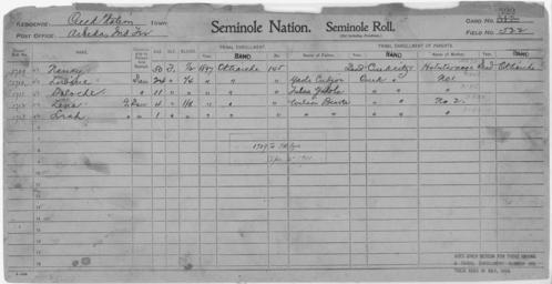 Keywords: Enrollment for Seminole Census Card 522 - NARA - 268096.tif Scope and content Name Yadi Cudjoe Type Parent Sex Male City of Residence Creek Name Wilson Deaver Type Parent Sex Male City of Residence Creek Name Hotutsonaga Type Parent Sex Female City of Residence o Name Leah Type By Blood Age 1 Sex Female Degree Indian Blood 1/8 Roll Number 1713 City of Residence o Name Lena Type By Blood Age 4 Sex Female Degree Indian Blood 1/8 Roll Number 1712 City of Residence o Name Lowine Type By Blood Age 24 Sex Female Degree Indian Blood 1/4 Roll Number 1710 City of Residence o Name Nancy Type By Blood Age 50 Sex Female Degree Indian Blood 1/2 Roll Number 1709 City of Residence o Name Saloche Type By Blood Age 11 Sex Female Degree Indian Blood 1/4 Roll Number 1711 City of Residence o Name Tulsa Yahola Type Parent Sex Male City of Residence Creek General notes 268096 Local identifier 75-53A-SEMINOLE 522 Department of the Interior Office of Indian Affairs Office of the Commissioner to the Five Civilized Tribes 1893 - 1914 NARA's Southwest Region Fort Worth NRFA 1400 John Burgess Drive Fort Worth TX 76140 Record group Record Group 75 Records of the Bureau of Indian Affairs 1793 - 1999 Record group ARC 404 Enrollment Cards compiled 1898 - 1914 Series ARC 251747 File unit File unit ARC Variant control numbers NAIL Control Number NRFF-75-53A-29300<br /> NAIL Control Number NRFF-75-53A-30046<br /> NAIL Control Number NRFF-75-53A-36794<br /> NAIL Control Number NRFF-75-53A-39210<br /> NAIL Control Number NRFF-75-53A-39276<br /> NAIL Control Number NRFF-75-53A-40078<br /> NAIL Control Number NRFF-75-53A-42944<br /> NAIL Control Number NRFF-75-53A-45635<br /> NAIL Control Number NRFF-75-53A-52285<br /> NAIL Control Number NRFF-75-53A-SEMINOLE 522 yes Other versions <gallery> File Enrollment_for_Seminole_Census_Card_522_-_NARA_-_268096 tif tif File Enrollment_for_Seminole_Census_Card_522_-_NARA_-_268096 jpg jpg </gallery> NARA-cooperation PD-USGov Seminole census cards NARA TIF images with categorized JPGs |