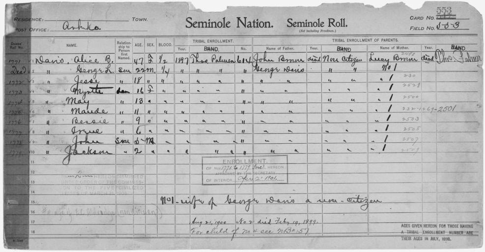 Keywords: Enrollment for Seminole Census Card 553 - NARA - 268127.jpg Scope and content Name John Brown Type Parent Sex Male Name Lucy Brown Type Parent Sex Female City of Residence tp Name Alice B Davis Type By Blood Age 47 Sex Female Degree Indian Blood 1/2 Roll Number 1771 City of Residence tp Name Bessie Davis Type By Blood Age 9 Sex Female Degree Indian Blood 1/4 Roll Number 1776 City of Residence tp Name George L Davis Type By Blood Age 22 Sex Male Degree Indian Blood 1/4 City of Residence tp Name Irene Davis Type By Blood Age 6 Sex Female Degree Indian Blood 1/4 Roll Number 1777 City of Residence tp Name Jackson Davis Type By Blood Age 2 Sex Male Degree Indian Blood 1/4 Roll Number 1779 City of Residence tp Name Jesse Davis Type By Blood Age 18 Sex Male Degree Indian Blood 1/4 Roll Number 1772 City of Residence tp Name John Davis Type By Blood Age 5 Sex Male Degree Indian Blood 1/4 Roll Number 1778 City of Residence tp Name Maude Davis Type By Blood Age 11 Sex Female Degree Indian Blood 1/4 Roll Number 1775 City of Residence tp Name May Davis Type By Blood Age 13 Sex Female Degree Indian Blood 1/4 Roll Number 1774 City of Residence tp Name Myrtle Davis Type By Blood Age 16 Sex Female Degree Indian Blood 1/4 Roll Number 1773 City of Residence tp General notes 268127 Local identifier 75-53A-SEMINOLE 553 Department of the Interior Office of Indian Affairs Office of the Commissioner to the Five Civilized Tribes 1893 - 1914 NARA's Southwest Region Fort Worth NRFA 1400 John Burgess Drive Fort Worth TX 76140 Record group Record Group 75 Records of the Bureau of Indian Affairs 1793 - 1999 Record group ARC 404 Enrollment Cards compiled 1898 - 1914 Series ARC 251747 File unit File unit ARC Variant control numbers NAIL Control Number NRFF-75-53A-25813<br /> NAIL Control Number NRFF-75-53A-25870<br /> NAIL Control Number NRFF-75-53A-29556<br /> NAIL Control Number NRFF-75-53A-29582<br /> NAIL Control Number NRFF-75-53A-29695<br /> NAIL Control Number NRFF-75-53A-29716<br /> NAIL Control Number NRFF-75-53A-29724<br /> NAIL Control Number NRFF-75-53A-29753<br /> NAIL Control Number NRFF-75-53A-29793<br /> NAIL Control Number NRFF-75-53A-29857<br /> NAIL Control Number NRFF-75-53A-29858<br /> NAIL Control Number NRFF-75-53A-29876<br /> NAIL Control Number NRFF-75-53A-SEMINOLE 553 Other versions <gallery> File Enrollment_for_Seminole_Census_Card_553_-_NARA_-_268127 tif tif File Enrollment_for_Seminole_Census_Card_553_-_NARA_-_268127 jpg jpg </gallery> NARA-cooperation PD-USGov Seminole census cards |