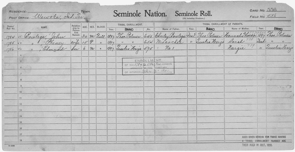 Keywords: Enrollment for Seminole Census Card 556 - NARA - 268130.tif Scope and content Name Charley Bowlegs Type Parent Sex Male City of Residence tp Name Edmund Bowlegs Type By Blood Age 6 Sex Male Degree Indian Blood Full Roll Number 1786 City of Residence th Name John Bowlegs Type By Blood Age 30 Sex Male Degree Indian Blood Full Roll Number 1784 City of Residence tp Name Pheney Bowlegs Type By Blood Age 15 Sex Female Degree Indian Blood Full Roll Number 1785 City of Residence tp Name Miccochee Type Parent Sex Male City of Residence th Name Nargie Type Parent Sex Female City of Residence th Name Hannah Thocco Type Parent Sex Female City of Residence tp General notes 268130 Local identifier 75-53A-SEMINOLE 556 Department of the Interior Office of Indian Affairs Office of the Commissioner to the Five Civilized Tribes 1893 - 1914 NARA's Southwest Region Fort Worth NRFA 1400 John Burgess Drive Fort Worth TX 76140 Record group Record Group 75 Records of the Bureau of Indian Affairs 1793 - 1999 Record group ARC 404 Enrollment Cards compiled 1898 - 1914 Series ARC 251747 File unit File unit ARC Variant control numbers NAIL Control Number NRFF-75-53A-25412<br /> NAIL Control Number NRFF-75-53A-25422<br /> NAIL Control Number NRFF-75-53A-25484<br /> NAIL Control Number NRFF-75-53A-25512<br /> NAIL Control Number NRFF-75-53A-41961<br /> NAIL Control Number NRFF-75-53A-42992<br /> NAIL Control Number NRFF-75-53A-49010<br /> NAIL Control Number NRFF-75-53A-SEMINOLE 556 yes Other versions <gallery> File Enrollment_for_Seminole_Census_Card_556_-_NARA_-_268130 tif tif File Enrollment_for_Seminole_Census_Card_556_-_NARA_-_268130 jpg jpg </gallery> NARA-cooperation PD-USGov Seminole census cards NARA TIF images with categorized JPGs |