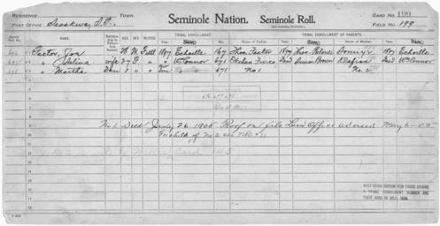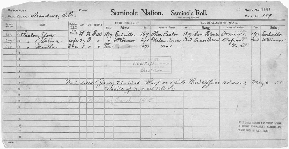 | Keywords: Enrollment for Seminole Census Card 199 - NARA - 267773.jpg Scope and content Name Joe Factor Type By Blood Age 28 Sex Male Degree Indian Blood Full Roll Number 696 City of Residence e Name Martha Factor Type By Blood Age 1 Sex Female Degree Indian Blood Full Roll Number 698 City of Residence wc Name Salina Factor Type By Blood Age 27 Sex Female Degree Indian Blood Full Roll Number 697 City of Residence wc Name Thomas Factor Type Parent Sex Male City of Residence tp Name Okchan Fixico Type Parent Sex Male City of Residence sb Name Klafisa Type Parent Sex Female City of Residence wc Name Soniye Type Parent Sex Female City of Residence e General notes 267773 Local identifier 75-53A-SEMINOLE 199 Department of the Interior Office of Indian Affairs Office of the Commissioner to the Five Civilized Tribes 1893 - 1914 NARA's Southwest Region Fort Worth NRFA 1400 John Burgess Drive Fort Worth TX 76140 Record group Record Group 75 Records of the Bureau of Indian Affairs 1793 - 1999 Record group ARC 404 Enrollment Cards compiled 1898 - 1914 Series ARC 251747 File unit File unit ARC Variant control numbers NAIL Control Number NRFF-75-53A-31219<br /> NAIL Control Number NRFF-75-53A-31239<br /> NAIL Control Number NRFF-75-53A-31256<br /> NAIL Control Number NRFF-75-53A-31265<br /> NAIL Control Number NRFF-75-53A-32019<br /> NAIL Control Number NRFF-75-53A-38814<br /> NAIL Control Number NRFF-75-53A-47629<br /> NAIL Control Number NRFF-75-53A-SEMINOLE 199 Other versions <gallery> File Enrollment_for_Seminole_Census_Card_199_-_NARA_-_267773 tif tif File Enrollment_for_Seminole_Census_Card_199_-_NARA_-_267773 jpg jpg </gallery> NARA-cooperation PD-USGov Seminole census cards |