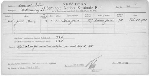 | Keywords: Enrollment for Seminole Census Card 80 - NARA - 267654.tif Scope and content Name Nancy Jones Type Newborn Age 3 Sex Female Degree Indian Blood FULL Roll Number 105 Post Office Mckusukey Name Cophoke Type Parent Sex Female City of Residence ee Name Contulla Harjo Type By Blood Age 45 Sex Male Degree Indian Blood Full Roll Number 282 City of Residence th Name Juffey Harjo Type By Blood Age 1 Sex Male Degree Indian Blood Full Roll Number 284 City of Residence ee Name Monachega Harjo Type By Blood Age 35 Sex Female Degree Indian Blood Full Roll Number 283 City of Residence ee Name Nokfah Harjo Type Parent Sex Male City of Residence ee Name Isesego Type Parent Sex Male City of Residence th Name Joanna Type By Blood Age 8 Sex Female Degree Indian Blood Full Roll Number 286 City of Residence ee Name Sallie Type By Blood Age 9 Sex Female Degree Indian Blood Full Roll Number 285 City of Residence ee Name Carolina Bennett Type Newborn Freedmen-Rejected Age 1 Sex Female Degree Indian Blood Not Reported Roll Number 121 Post Office Earlboro Name Willie Bennett Type Newborn Freedmen-Rejected Age 1 Sex Male Degree Indian Blood Not Reported Roll Number 122 Post Office Earlboro General notes 267654 Local identifier 75-53A-SEMINOLE 80 Department of the Interior Office of Indian Affairs Office of the Commissioner to the Five Civilized Tribes 1893 - 1914 NARA's Southwest Region Fort Worth NRFA 1400 John Burgess Drive Fort Worth TX 76140 Record group Record Group 75 Records of the Bureau of Indian Affairs 1793 - 1999 Record group ARC 404 Enrollment Cards compiled 1898 - 1914 Series ARC 251747 File unit File unit ARC Variant control numbers NAIL Control Number NRFF-75-53A-28860<br /> NAIL Control Number NRFF-75-53A-34239<br /> NAIL Control Number NRFF-75-53A-34531<br /> NAIL Control Number NRFF-75-53A-34781<br /> NAIL Control Number NRFF-75-53A-34861<br /> NAIL Control Number NRFF-75-53A-37112<br /> NAIL Control Number NRFF-75-53A-37644<br /> NAIL Control Number NRFF-75-53A-45620<br /> NAIL Control Number NRFF-75-53A-52638<br /> NAIL Control Number NRFF-75-53A-52925<br /> NAIL Control Number NRFF-75-53A-52926<br /> NAIL Control Number NRFF-75-53A-SEMINOLE 80 yes Other versions <gallery> File Enrollment_for_Seminole_Census_Card_80_-_NARA_-_267654 tif tif File Enrollment_for_Seminole_Census_Card_80_-_NARA_-_267654 jpg jpg </gallery> NARA-cooperation PD-USGov Cherokee census cards NARA TIF images with categorized JPGs |