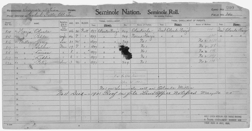 | Keywords: Enrollment for Seminole Census Card 240 - NARA - 267814.tif Scope and content Name Nocus Harjo Type Parent Sex Male City of Residence oh Name Okoske Harjo Type By Blood Age 46 Sex Male Degree Indian Blood Full Roll Number 814 City of Residence oh Name Pahke Harjo Type By Blood Age 40 Sex Female Degree Indian Blood Full Roll Number 815 City of Residence oh Name Josey Miller Type By Blood Age 21 Sex Male Degree Indian Blood Full Roll Number 816 City of Residence oh Name Liddie Miller Type By Blood Age 6 Sex Female Degree Indian Blood Full Roll Number 819 City of Residence oh Name Louisa Miller Type By Blood Age 8 Sex Female Degree Indian Blood Full Roll Number 818 City of Residence oh Name Peter Miller Type By Blood Age 3 Sex Male Degree Indian Blood Full Roll Number 820 City of Residence oh Name Salina Miller Type By Blood Age 19 Sex Female Degree Indian Blood Full Roll Number 817 City of Residence oh General notes 267814 Local identifier 75-53A-SEMINOLE 240 Department of the Interior Office of Indian Affairs Office of the Commissioner to the Five Civilized Tribes 1893 - 1914 NARA's Southwest Region Fort Worth NRFA 1400 John Burgess Drive Fort Worth TX 76140 Record group Record Group 75 Records of the Bureau of Indian Affairs 1793 - 1999 Record group ARC 404 Enrollment Cards compiled 1898 - 1914 Series ARC 251747 File unit File unit ARC Variant control numbers NAIL Control Number NRFF-75-53A-34858<br /> NAIL Control Number NRFF-75-53A-34909<br /> NAIL Control Number NRFF-75-53A-34928<br /> NAIL Control Number NRFF-75-53A-42079<br /> NAIL Control Number NRFF-75-53A-42084<br /> NAIL Control Number NRFF-75-53A-42092<br /> NAIL Control Number NRFF-75-53A-42108<br /> NAIL Control Number NRFF-75-53A-42116<br /> NAIL Control Number NRFF-75-53A-SEMINOLE 240 yes Other versions <gallery> File Enrollment_for_Seminole_Census_Card_240_-_NARA_-_267814 tif tif File Enrollment_for_Seminole_Census_Card_240_-_NARA_-_267814 jpg jpg </gallery> NARA-cooperation PD-USGov Seminole census cards NARA TIF images with categorized JPGs |