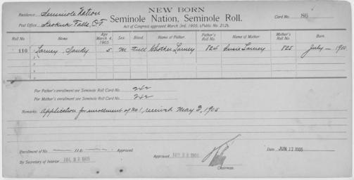 | Keywords: Enrollment for Seminole Census Card 86 - NARA - 267660.tif Scope and content Name Nocus Ika Type Parent Sex Male City of Residence sb Name Jim Walker Type Parent Sex Male City of Residence nh Name Kissie Walker Type By Blood Age 9 Sex Female Degree Indian Blood Full Roll Number 304 City of Residence tp Name Leah Walker Type By Blood Age 30 Sex Female Degree Indian Blood Full Roll Number 302 City of Residence tp Name Lucinda Walker Type By Blood Age 15 Sex Female Degree Indian Blood Full Roll Number 303 City of Residence tp Name Sam Walker Type By Blood Age 35 Sex Male Degree Indian Blood Full Roll Number 301 City of Residence nh Name Sandy Larney Type Newborn Age 5 Sex Male Degree Indian Blood FULL Roll Number 110 Post Office Keokuk Falls Name Ruthie Davis Type Newborn Freedmen-Rejected Age 4 Sex Female Degree Indian Blood Not Reported Roll Number 91 Post Office Wewoka General notes 267660 Local identifier 75-53A-SEMINOLE 86 Department of the Interior Office of Indian Affairs Office of the Commissioner to the Five Civilized Tribes 1893 - 1914 NARA's Southwest Region Fort Worth NRFA 1400 John Burgess Drive Fort Worth TX 76140 Record group Record Group 75 Records of the Bureau of Indian Affairs 1793 - 1999 Record group ARC 404 Enrollment Cards compiled 1898 - 1914 Series ARC 251747 File unit File unit ARC Variant control numbers NAIL Control Number NRFF-75-53A-37031<br /> NAIL Control Number NRFF-75-53A-50500<br /> NAIL Control Number NRFF-75-53A-50508<br /> NAIL Control Number NRFF-75-53A-50510<br /> NAIL Control Number NRFF-75-53A-50516<br /> NAIL Control Number NRFF-75-53A-50538<br /> NAIL Control Number NRFF-75-53A-52647<br /> NAIL Control Number NRFF-75-53A-52933<br /> NAIL Control Number NRFF-75-53A-SEMINOLE 86 yes Other versions <gallery> File Enrollment_for_Seminole_Census_Card_86_-_NARA_-_267660 tif tif File Enrollment_for_Seminole_Census_Card_86_-_NARA_-_267660 jpg jpg </gallery> NARA-cooperation PD-USGov Cherokee census cards NARA TIF images with categorized JPGs |