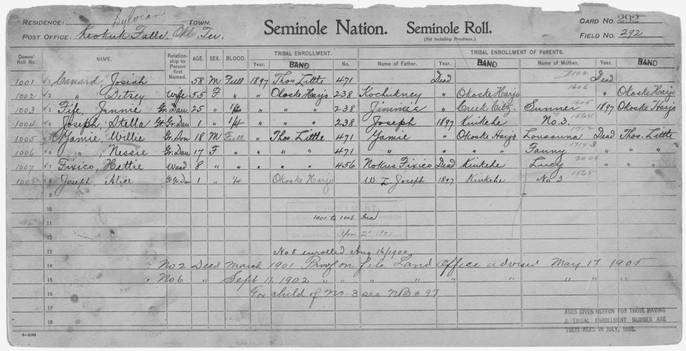 Keywords: Enrollment for Seminole Census Card 292 - NARA - 267866.jpg Scope and content Name Betsey Canard Type By Blood Age 55 Sex Female Degree Indian Blood Full Roll Number 1002 City of Residence oh Name Josiah Canard Type By Blood Age 58 Sex Male Degree Indian Blood Full Roll Number 1001 City of Residence tl Name Jennie Fife Type By Blood Age 25 Sex Female Degree Indian Blood 1/2 Roll Number 1003 City of Residence oh Name Hettie Fixico Type By Blood Age 8 Sex Female Degree Indian Blood Full Roll Number 1007 City of Residence tl Name Nokus Fixico Type Parent Sex Male City of Residence k Name Stella Hoseph Type By Blood Age 1 Sex Female Degree Indian Blood 1/4 Roll Number 1004 City of Residence oh Name Alice Joseph Type By Blood Age 1 Sex Female Degree Indian Blood 1/4 Roll Number 1008 City of Residence oh Name W L Joseph Type Parent Sex Male City of Residence k Name Kochukney Type Parent Sex Male City of Residence oh Name Lousanna Type Parent Sex Female City of Residence oh Name Nessie Yamie Type By Blood Age 17 Sex Female Degree Indian Blood Full Roll Number 1006 City of Residence tl Name Willie Yamie Type By Blood Age 18 Sex Male Degree Indian Blood Full Roll Number 1005 City of Residence tl General notes 267866 Local identifier 75-53A-SEMINOLE 292 Department of the Interior Office of Indian Affairs Office of the Commissioner to the Five Civilized Tribes 1893 - 1914 NARA's Southwest Region Fort Worth NRFA 1400 John Burgess Drive Fort Worth TX 76140 Record group Record Group 75 Records of the Bureau of Indian Affairs 1793 - 1999 Record group ARC 404 Enrollment Cards compiled 1898 - 1914 Series ARC 251747 File unit File unit ARC Variant control numbers NAIL Control Number NRFF-75-53A-26998<br /> NAIL Control Number NRFF-75-53A-27021<br /> NAIL Control Number NRFF-75-53A-31484<br /> NAIL Control Number NRFF-75-53A-31908<br /> NAIL Control Number NRFF-75-53A-32014<br /> NAIL Control Number NRFF-75-53A-36755<br /> NAIL Control Number NRFF-75-53A-38162<br /> NAIL Control Number NRFF-75-53A-38177<br /> NAIL Control Number NRFF-75-53A-38883<br /> NAIL Control Number NRFF-75-53A-39945<br /> NAIL Control Number NRFF-75-53A-52355<br /> NAIL Control Number NRFF-75-53A-52356<br /> NAIL Control Number NRFF-75-53A-SEMINOLE 292 Other versions <gallery> File Enrollment_for_Seminole_Census_Card_292_-_NARA_-_267866 tif tif File Enrollment_for_Seminole_Census_Card_292_-_NARA_-_267866 jpg jpg </gallery> NARA-cooperation PD-USGov Seminole census cards