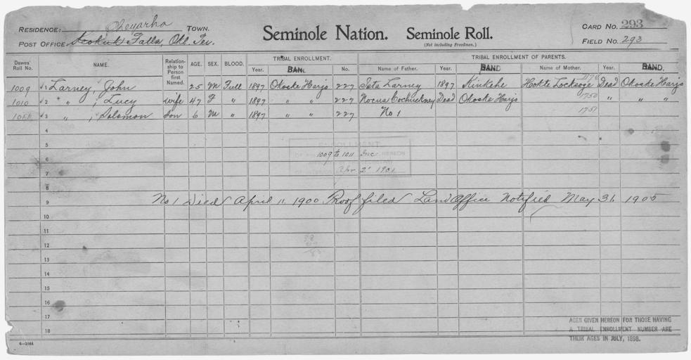 Keywords: Enrollment for Seminole Census Card 293 - NARA - 267867.jpg Scope and content Name Nocus Cochuckney Type Parent Sex Male City of Residence oh Name Ista Larney Type Parent Sex Male City of Residence k Name John Larney Type By Blood Age 25 Sex Male Degree Indian Blood Full Roll Number 1009 City of Residence oh Name Lucy Larney Type By Blood Age 47 Sex Female Degree Indian Blood Full Roll Number 1010 City of Residence oh Name Solomon Larney Type By Blood Age 6 Sex Male Degree Indian Blood Full Roll Number 1011 City of Residence oh Name Hookte Locksoge Type Parent Sex Female City of Residence oh General notes 267867 Local identifier 75-53A-SEMINOLE 293 Department of the Interior Office of Indian Affairs Office of the Commissioner to the Five Civilized Tribes 1893 - 1914 NARA's Southwest Region Fort Worth NRFA 1400 John Burgess Drive Fort Worth TX 76140 Record group Record Group 75 Records of the Bureau of Indian Affairs 1793 - 1999 Record group ARC 404 Enrollment Cards compiled 1898 - 1914 Series ARC 251747 File unit File unit ARC Variant control numbers NAIL Control Number NRFF-75-53A-28386<br /> NAIL Control Number NRFF-75-53A-39004<br /> NAIL Control Number NRFF-75-53A-39019<br /> NAIL Control Number NRFF-75-53A-39030<br /> NAIL Control Number NRFF-75-53A-39063<br /> NAIL Control Number NRFF-75-53A-39665<br /> NAIL Control Number NRFF-75-53A-SEMINOLE 293 Other versions <gallery> File Enrollment_for_Seminole_Census_Card_293_-_NARA_-_267867 tif tif File Enrollment_for_Seminole_Census_Card_293_-_NARA_-_267867 jpg jpg </gallery> NARA-cooperation PD-USGov Seminole census cards