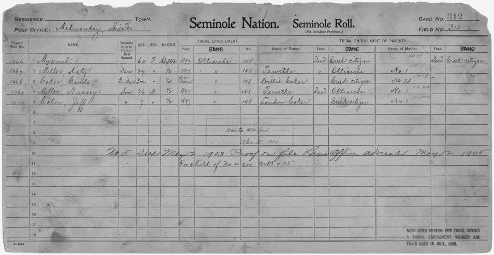 | Keywords: Enrollment for Seminole Census Card 312 - NARA - 267886.jpg Scope and content Name Cinda Coker Type By Blood Age 1 Sex Female Degree Indian Blood 1/4 Roll Number 1068 City of Residence o Name Jeff Coker Type By Blood Age 7 Sex Male Degree Indian Blood 1/2 Roll Number 1070 City of Residence o Name London Coker Type Parent Sex Male City of Residence Creek Name Willie Coker Type Parent Sex Male City of Residence Creek Name Katy Miller Type By Blood Age 27 Sex Female Degree Indian Blood 1/2 Roll Number 1067 City of Residence o Name Nussey Miller Type By Blood Age 26 Sex Male Degree Indian Blood 1/2 Roll Number 1069 City of Residence o Name Munnah Type By Blood Age 60 Sex Female Degree Indian Blood AC Roll Number 1066 City of Residence o Name Tewetke Type Parent Sex Male City of Residence o General notes 267886 Local identifier 75-53A-SEMINOLE 312 Department of the Interior Office of Indian Affairs Office of the Commissioner to the Five Civilized Tribes 1893 - 1914 NARA's Southwest Region Fort Worth NRFA 1400 John Burgess Drive Fort Worth TX 76140 Record group Record Group 75 Records of the Bureau of Indian Affairs 1793 - 1999 Record group ARC 404 Enrollment Cards compiled 1898 - 1914 Series ARC 251747 File unit File unit ARC Variant control numbers NAIL Control Number NRFF-75-53A-28430<br /> NAIL Control Number NRFF-75-53A-28451<br /> NAIL Control Number NRFF-75-53A-28473<br /> NAIL Control Number NRFF-75-53A-28502<br /> NAIL Control Number NRFF-75-53A-42081<br /> NAIL Control Number NRFF-75-53A-42104<br /> NAIL Control Number NRFF-75-53A-42790<br /> NAIL Control Number NRFF-75-53A-48919<br /> NAIL Control Number NRFF-75-53A-SEMINOLE 312 Other versions <gallery> File Enrollment_for_Seminole_Census_Card_312_-_NARA_-_267886 tif tif File Enrollment_for_Seminole_Census_Card_312_-_NARA_-_267886 jpg jpg </gallery> NARA-cooperation PD-USGov Seminole census cards |