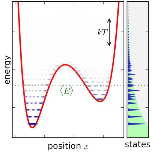 | Keywords: Ensemble quantum 1DOF canonical.png en Ensemble canonically distributed over energy for a quantum system consisting of one particle in a potential well 2013-10-30 22 45 43 own Nanite Source Created with Matplotlib Python source code Requires matplotlib <source lang python > from pylab import figformat ' png' saveopts 'dpi' 300 'bbox_inches' 'tight' 'transparent' True 'frameon' True seterr divide 'ignore' Very important number smaller means more classical finer-spaced discrete levels larger means more quantum fewer discrete levels hbar 0 7/ 2 pi temp_canonical 4 1 energy_microcanonical -2 0 range_microcanonical 1 0 micro_e0 energy_microcanonical - 0 5 range_microcanonical micro_e1 energy_microcanonical + 0 5 range_microcanonical def potential x return x 6 + 4 x 3 - 5 x 2 - 4 x x linspace -2 5 2 5 1001 dx x1 - x0 U potential x mass 1 0 compute pixel edges used for pcolormesh xcorners zeros len x +1 xcorners len x x-0 5 dx xcorners-1 x-1 + 0 5 dx make an energy range for plots vs energy E linspace -20 20 10001 define color map that is transparent for low values and dark blue for high values weighted to show low probabilities well cdic 'red' 0 0 0 1 0 0 'green' 0 0 0 1 0 0 'blue' 0 0 7 0 7 1 0 7 0 7 'alpha' 0 0 0 0 1 0 4 0 4 0 2 0 6 0 6 0 4 0 8 0 8 0 6 0 9 0 9 1 1 1 cm_prob matplotlib colors LinearSegmentedColormap 'prob' cdic To get eigenvalues we need to set up a NxN matrix for the Schrodinger equation Hamiltonian For the momentum operator -hbar 2/ 2 m d 2/dx 2 the typical central difference approximation will be used H zeros len x len x set diagonal H ravel 0 len x +1 hbar hbar/ mass dx dx H ravel 0 len x +1 + U set above and below diagonal H ravel 1 len x +1 -0 5 hbar hbar/ mass dx dx H ravel len x len x +1 -0 5 hbar hbar/ mass dx dx Right the hamiltonian is set up so let's just go ahead and diagonalize it poink eigval eigvec eigh H def doev H Emax lowE_idx find eigval<Emax figure for i in lowE_idx plot x eigvec i label 'E '+str eigvali legend fontsize 8 micro eigval > micro_e0 eigval < micro_e1 1 0 print microcanonical E0 energy_microcanonical Delta 0 5 range_microcanonical avg energy print sum eigval micro /sum micro canonical exp -eigval/temp_canonical canonical_avgE sum eigval canonical /sum canonical print canonical T temp_canonical avg energy print canonical_avgE Boring level plot fig figure ax axes plot x potential x linewidth 3 for i in find eigval< 13 axhline eigvali color 0 5 0 5 0 5 linewidth 0 5 zorder -1 ylim -8 9 xlim -2 1 1 7 fig get_axes 0 xaxis set_ticks -2 -1 0 1 xlabel position x ylabel potential U x fig set_size_inches 3 3 fig patch set_alpha 0 savefig quant_potential_eigval_lines +figformat saveopts def levelplot weights Plot the potential with eigenstates' wavefunctions superimposed shown weights list fractions to multiply each eigenstate probability e g weight 0 do not show weight 1 fully show name filename to save to fig figure ax axes 0 08 0 1 0 73 0 89 0 125 0 1 0 71 0 8 plot x potential x linewidth 2 color 'r' zorder -1 maxp dx 3 5 amax weights eigwidth 0 2 for i in find eigval< 9 Here we plot the eigenfunctions as horizontal bars of varying darkness with height set by the energy eigenvalue if weightsi 0 continue don't plot levels with zero weight pdist eigvec i 2 weightsi pdist shape 1 len x extent amin x -0 5 dx amax x +0 5 dx eigvali-0 5 eigwidth eigvali+0 5 eigwidth img imshow vstack pdist pdist cmap cm_prob extent extent interpolation 'none' aspect 'auto' Alternate code using pcolormesh doesn't work because of ugly edges ycorners vstack eigvali-0 5 eigwidth len x +1 eigvali+0 5 eigwidth len x +1 pcolormesh vstack xcorners xcorners ycorners pdist cmap cm_prob clim 0 maxp ylim -9 9 xlim -2 1 1 7 fig get_axes 0 xaxis set_ticks -2 -1 0 1 ax xaxis set_ticklabels ax yaxis set_ticklabels ax xaxis labelpad 2 ax yaxis labelpad -3 xlabel position x ylabel energy ax axes 0 83 0 1 0 14 0 89 axisbg 0 95 0 95 0 95 ax xaxis set_ticks ax yaxis set_ticklabels ax yaxis set_ticks_position 'right' ylim -9 9 xlabel states dos E 0 0 for i Elevel in enumerate eigval Here we sum up the density of states function if Elevel > 20 continue don't waste time with high levels dos + exp -4 E-Elevel /eigwidth 2 weightsi fill_betweenx E dos linewidth 0 color 0 2 0 2 0 76 xlim -0 05 max dos max dos 1 1 fig set_size_inches 3 3 fig patch set_alpha 0 levelplot ones len eigval savefig quant_potential_eigval_pdists +figformat saveopts levelplot micro sca gcf axes0 axhspan micro_e0 micro_e1 color 0 7 1 0 7 zorder -2 sca gcf axes1 axhspan micro_e0 micro_e1 color 0 7 1 0 7 zorder -2 savefig quant_potential_eigval_pdists_micro +figformat saveopts levelplot canonical sca gcf axes0 annotate \\langle E\\rangle -0 5 canonical_avgE textcoords None verticalalignment 'top' color 0 0 4 0 axhline canonical_avgE linestyle 'dotted' linewidth 1 color 0 0 4 0 annotate 1 2 7 -temp_canonical 1 2 7 arrowprops 'arrowstyle' '<->' text 1 15 7 -0 5 temp_canonical ' kT ' horizontalalignment 'right' verticalalignment 'center' sca gcf axes1 axhline canonical_avgE linestyle 'dotted' linewidth 1 color 0 0 4 0 fill_betweenx E exp -E/temp_canonical linewidth 0 color 0 7 1 0 7 zorder -2 green exponential savefig quant_potential_eigval_pdists_canonical +figformat saveopts Position expectation values figure pdist zeros len x for i p in enumerate micro pdist + p eigvec i 2 if any micro plot x pdist/sum micro /dx label 'microcanonical' pdist zeros len x for i p in enumerate canonical pdist + p eigvec i 2 plot x pdist/sum canonical /dx label 'canonical' color 'g' xlim -2 1 1 7 fig get_axes 0 xaxis set_ticks -2 -1 0 1 xlabel position x ylabel PDF of position P x legend savefig quant_position_pdf +figformat saveopts </source> cc-zero Images with Python source code Uploaded with UploadWizard 1D potential wells Statistical ensemble |