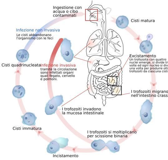 Keywords: Entamoeba histolytica life cycle-it.svg Entamoeba histolytica is an anaerobic parasitic protozoan part of the genus Entamoeba It infects predominantly humans and other primates Entamoeba histolytica un protozoaire anaƩrobie parasite appartenant au genre Entamoeba Cet amibe infecte principalement les humains et les autres primates Entamoeba_histolytica_life_cycle-en svg 50 2012-04-06 09 03 UTC Entamoeba_histolytica_life_cycle-en svg Mariana Ruiz Villarreal LadyofHats derivative work Radio89 Other versions/Entamoeba histolytica italian translation traduzione italiana Radio89 Entamoeba_histolytica_life_cycle-en svg Original upload log This image is a derivative work of the following images File Entamoeba_histolytica_life_cycle-en svg licensed with PD-user 2008-07-13T08 39 12Z LadyofHats 1029x976 273234 Bytes <nowiki>made it bigger again</nowiki> 2008-07-13T08 33 16Z LadyofHats 648x615 266461 Bytes <nowiki>added small points</nowiki> 2008-07-12T10 48 48Z LadyofHats 842x799 271874 Bytes <nowiki>made it bigger</nowiki> 2008-03-25T12 01 14Z LadyofHats 648x615 264728 Bytes <nowiki>more changes before trying to feature it</nowiki> 2008-03-14T11 21 35Z LadyofHats 648x615 258083 Bytes <nowiki></nowiki> 2008-03-11T15 39 53Z LadyofHats 648x615 229774 Bytes <nowiki>will reload it since it doesnt show</nowiki> 2008-03-11T15 33 07Z LadyofHats 648x615 229765 Bytes <nowiki>c for C t mm oh well</nowiki> 2008-03-11T14 56 27Z LadyofHats 648x615 229050 Bytes <nowiki> Entamoeba histolytica is an anaerobic parasitic protozoan part of the genus Entamoeba It infects predominantly humans and other primates self-made based on http //www dpd cdc gov/DPDx/HTM</nowiki> Uploaded with derivativeFX Cc-zero Entamoeba life cycle |