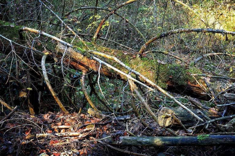 Keywords: environment nature damage forest storm tangle wood tree trunks aesthetic tribe road branches dead broken old gnarled dead plant waldsterben mood atmosphere end time environmental protection disaster