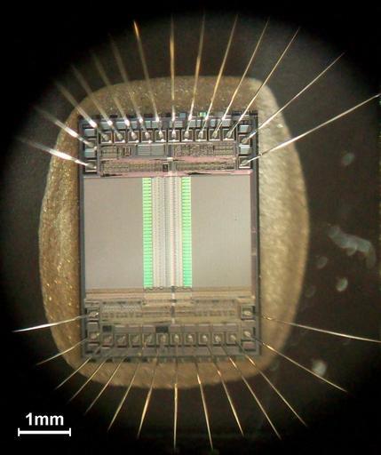 | Keywords: Epromf.jpg en Chip of a 256k EPROM with aluminum bond wires The grey area contains the storage cells wich are too small to be seen de Chip eines 256k EPROM mit Aluminium-Bonddrähten Der Bereich der Speicherzellen erscheint grau da die Vergrößerung nicht ausreicht own Ulfbastel PD EPROM Wire bonding |