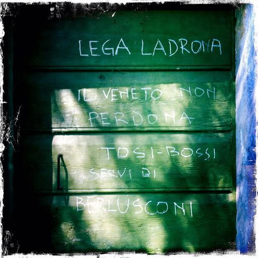Keywords: italy italia street wall verona politics lega tosi berlusconi elezioni scritte message green door torricelle veronetta text "Veneto does not forgive. Tosi - Bossi are Berluscony's slaves". Flavio Tosi is Verona's major, to be reelected (or rather not) in a couple of weeks. "Veneto does not forgive. Tosi - Bossi are Berluscony's slaves". Flavio Tosi is Verona's major, to be reelected (or rather not) in a couple of weeks.