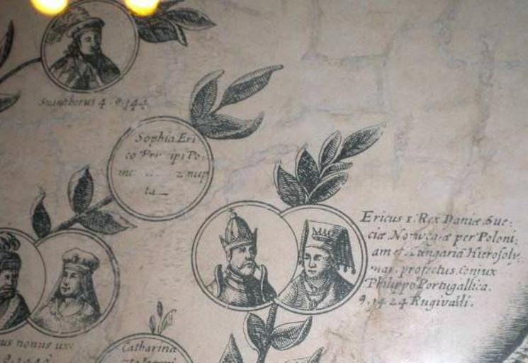 | Keywords: Eric & Philippa of Denmark, Norway & Sweden print (very old) 2010.jpg en Old print in Darłowo Castle with genealogical information about King Eric the Pomeranian of Scandinavia as released by image creator Ristesson;<br>Place Darłowo Poland User EmilEikS/Template Southerly Clubs Jacob Truedson Demitz for Ristesson 2010-10-23 Ristesson History Darłowo Castle Eric of Pomerania Philippa of England Images by Jacob Truedson Demitz Lars E J Ridderstedt; Lars Jacob | ||||