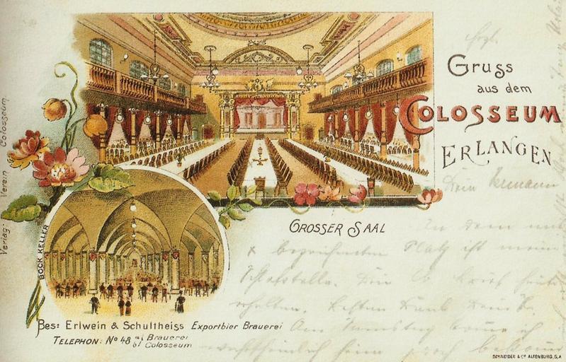 Keywords: Erlangen Postkarte 018.JPG Erlangen Großer Saal und Bockbierkeller im ehemaligen Colossium auch Kolosseum in der Henkestraße 28 Später mehrfach umgebaut seit 1964 stand das Haus leer Seit 1974 gehört das Gebäude zum Hotel Bayerischer Hof Scan aus dem Buch Christoph Friedrich Bertold Frhr von Haller und Andreas Jakob Erlanger Stadtlexikon W Tümmels Verlag Nürnberg 2002 ISBN 3-921590-89-2 Verein Colosseum ~ 1900 Henkestraße Erlangen 028 Postcards of Erlangen Bavaria in the 1900s PD-old |