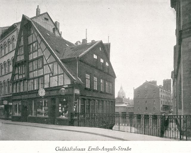 | Keywords: Ernst-August-Straße 8, Leineinsel Klein-Venedig, Brücke Leine Regierungsgebäude Brückmühle Neues Rathaus Hannover.jpg Blick auf das mutmaßlich Ende des 16 Jahrhunderts auf der Leineinsel Klein-Venedig in Hannover als Fachwerkhaus errichtete und ehemals denkmalgeschützte Geschäftshaus Ernst-August-Straße 8 gefolgt vom Gebäude mit der Hausnummer 9 in dem zum Zeitpunkt der um 1920 getätigten Aufnahme die Uhren- und Goldwarenhandlung des Hofuhrmachers August Speckmann seinen Sitz hatte Die seltene Fotografie hier als punktgerasterter Druck gewährt einen Blick von der Brücke an der Ecke Calenberger Straße entlang dem Königlichen Regierungsgebäude Dicasteriengebäude über die Leine und zur Brückmühle Ganz im Hintergrund ist bereits die Kuppel des 1913 eingeweihten Neuen Rathauses zu erkennen Nach den Zerstörungen durch die Luftangriffe auf Hannover im Zweiten Weltkrieg wurde der Brückmühlenarm der Leine zugeschüttet und nach Plänen von Stadtbaudirektor Rudolf Hillebrecht für die Autogerechte Stadt hier das mehrspurige Leibnizufer über den Standort hinweggeführt Paul Siedentopf Hauptschriftleiter Das Buch der alten Firmen der Stadt Hannover im Jahr 1927 Jubiläums-Verlag Walter Gerlach Leipzig 1927 S 313 ~ 1920 Zusammenstellung des Bildmaterials Karl Friedrich Leonhardt PD-old Ernst-August-Straße 8 Hannover Brückmühlenarm der Leine Hannover Brückmühle Hannover Regierungsgebäude Hannover Bridges in Hannover Ernst-August-Straße 9 Hannover |