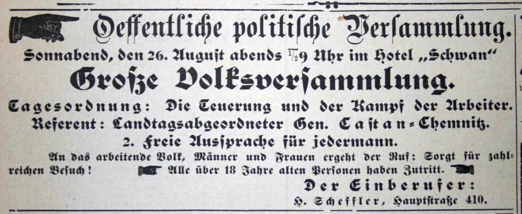 | Keywords: Ernst Castan in Schönheide Anzeige Schönheider Wochenblatt August 1910.jpg Schönheide im Erzgebirge Das Mitglied des sächsischen Landtages Ernst Castan Inhaber des Wahlbezirks Chemnitz 4 sprach am 26 August 1910 bei einer Veranstaltung im Hotel Schwan Die Ankündigung nennt nicht eine Partei als Veranstalter Ernst Castan war Mitglied der SPD Obwohl die Veranstaltung an einem Sonnabend war wurde erst auf 20 30 Uhr eingeladen Damals war es selbstverständlich dass sonnabends in den Fabriken und anderswo gearbeitet wurde Danach waren häusliche Arbeiten wie das Ausmisten des Kaninchenstalls und das Reinigungsbad zu erledigen So konnte auf 20 30 Uhr eingeladen werden “ Eine Anzeige im Schönheider Wochenblatt Zeitungsanzeige vom August 1910 Schönheider Wochenblatt 1910 Ernst Castan Schönheider Wochenblatt Cc-zero |