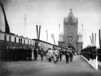 | Keywords: Eröffnung der Kaiserbrücke zwischen Mainz und Wiesbaden.jpg en Inauguration of Bridges between Mainz and Wiesbaden Kaiserbrücke zwischen Mainz und Wiesbaden am 1 Mai 1904 Die Aufnahme entstand am 1 April 1904 bei der Einweihung der Kaiserbrücke einer Eisenbahnbrücke über den Rhein zwischen der Mainzer Neustadt und Mainz-Amöneburg an der Kaiser Wilhelm II und Großherzog Ernst Ludwig und bei Rhein teilnahmen Sie sind etwa in der Bildmitte in Uniformmänteln und mit Pickelhaube zu sehen Rechts ist eine militärische Einheit in Paradeuniform angetreten links vor dem Zug eine Gruppe von Teilnehmern und Offiziellen Bei dem links haltenden Zug handelt es sich um den Hofzug Kaiser Wilhelms II mit dem kaiserlichen Salonwagen http //www lagis-hessen de/de/subjects/xsrec/current/4700/mode/base/setmode/base/sn/bd q YTowOnt9 http //www lagis-hessen de/img/bd/s3/242-004 jpg direct link 1904-05-01 L H Schiffer Wiesbaden Taunusstraße PD-old-70-1923 Kaiserbrücke Royal train of Wilhelm II of Prussia Wilhelm II of Germany in 1904 Ernest Louis Grand Duke of Hesse Black and white photographs People with vehicles 1904 in Mainz |