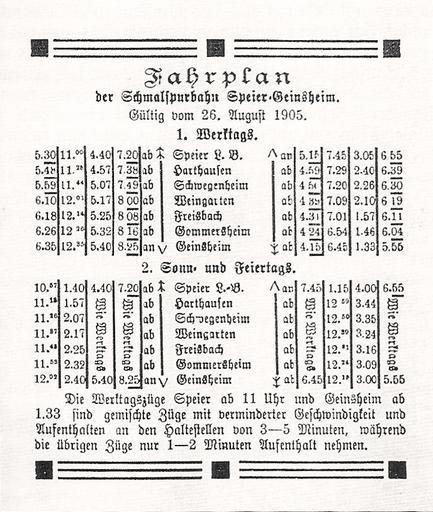 | Keywords: Eröffnungsfahrplanspeyergeinsheim.jpg de Eröffnungsfahrplan Speyer-Geinsheim 1905 2014-08-22 17 42 55 Literatur Hans-Ulrich Kroszewski Die Geschichte des žPfefferminzbähnels Die Gäubahn Neustadt - Gommersheim - Speyer Zeitzeugen erinnern sich Hekma-Verlag Maikammer 2009 978-3-9808288-5-7 author Custom license marker 2014 08 22 PD-old Lokalbahn Speyer “Neustadt |