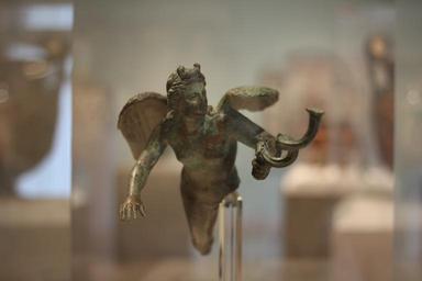 Keywords: Eros lamp holder.jpg century 1 BC Bronze Dallas Museum of Art Eros the Greek god of love is shown as a beautiful youth with both male and female characteristics The figure was originally part of a lamp holder and would have had an oil lamp on the tendril he holds in an outstretched hand The sculpture shares in the expressive dynamic qualities of later Greek Hellenistic art; it appears to be flying on the rich beautifully detailed wings The lamp from which the figure came was probably made in the eastern Mediterranean for a wealthy house or villa in Italy The bronze has been associated with a trove of Greek luxury goods recovered from an ancient shipwreck near the town of Mahdia on the coast of Tunisia http //museum dma org 9090/emuseum/view/objects/asitem/2036/27/title-asc;jsessionid D315CFB7F9E05115A4A5062F651EDA78 t state flow 1a12ce2a-5069-4947-8315-b1733df78d5f Curator Anne Bromberg discusses the Eros lamp holder http //www dma mobi/ObjectDetail/dma_424610 own Alexmarie28 2011-04-04 PD-old-100 Statues of Eros Ancient Greek oil lamps Androgyny in ancient art Ancient Roman art in the Dallas Museum of Art |