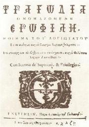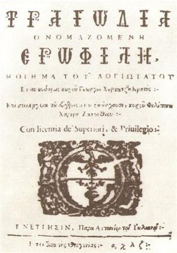 | Keywords: Erwfili exwfyllo.jpg  en Cover of Erofili Εξώφυλλο της Ερωφίλης α ό την έκδοση του 1637 Transferred from http //el wikipedia org el wikipedia; transferred to Commons by User MARKELLOS using http //tools wikimedia de/~magnus/commonshelper php CommonsHelper 1637 author This image is in the public domain PD-old-100 Original upload log page el wikipedia Erwfili_exwfyllo jpg 2007-01-27 20 09 Elena153 337480 38966 bytes <nowiki>Εξώφυλλο της Ερωφίλης α ό την έκδοση του 1637</nowiki> Greek literature Title pages |