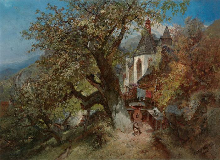 Keywords: Erwin Oehme In der Bergstadt Graupen 1902.jpg In der Bergstadt Graupen http //www zeller de zeller de oil on canvas cm 88 93 1902 Creator Ernst Erwin Oehme PD-old-100-1923 1907 Images from Auktionshaus Zeller Ernst Erwin Oehme 1902 paintings Churches in art History of Krupka Church of Saint Anne in Krupka Oil paintings of dogs