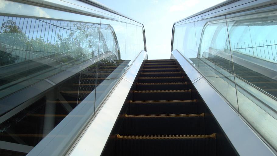 Keywords: escalator metal sky glass iron moving transport up city