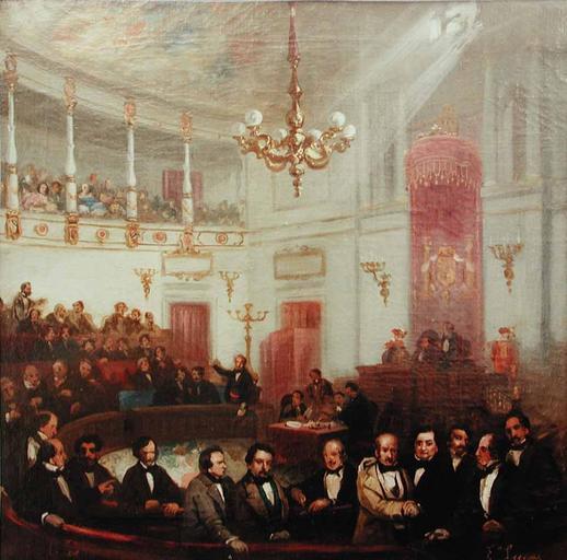 | Keywords: Escena congreso de los diputados siglo XIX Eugenio Lucas Velázquez.jpg El lienzo representa el desarrollo de un acto parlamentario en el Salón de Sesiones del Congreso de los Diputados de España a mediados del siglo XIX Circa 1854-1855 oil canvas Size cm Institution Palacio de las Cortes Madrid object history exhibition history credit line accession number http //narros congreso es/visitanueva/fondos jsp fm 1 fc 1 mp 3 PD-old-100 Eugenio Lucas Velázquez Paintings in the Palacio de las Cortes Spain in the 1850s Politics in art |