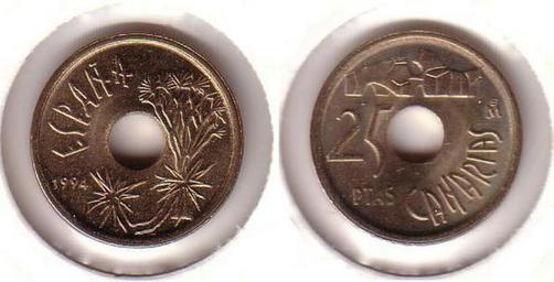 | Keywords: ESP-25ptas7.jpg en 25 pesetas Canary Islands es 25 pesetas Islas Canarias Banco de España coin Trabajo propio photograph Fábrica Nacional de Moneda y Timbre coin Mvllez photograph 1994 25 peseta coins Coins with round hole 1994 in Spain Canary Islands |