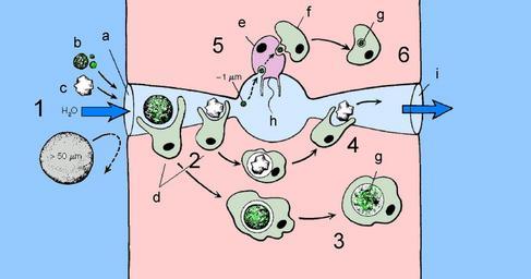 | Keywords: Esponjas alimentacion.jpg Alimentación de las esponjas Commons Ishrana PNG 10-III-07 X Vázquez PD Ishrana PNG Español Esquema de la alimentación de las esponjas 1 el agua cargada de partículas penetra por los poros; 2 las partículas grandes son fagocitadas por los aqueocitos; 3 las partículas orgánicas son digeridas intracelularmente por los arqueocitos; 4 las partículas inorgánicas como granos de arena son expulsadas en el canal exhalante; 5 las partículas pequeñas penetran en la cámara vibrátil y son fagocitadas por los coanocitos que las transfieren a los arqueocitos; 6 las partículas son digeridas intracelularmente por los arqueocitos a poro inhalante; b partículas orgánicas; c partícula inorgánica; d arqueocitos; e coanocito; f arqueocito; g vacuola digestiva Xvazquez Porifera diagrams |