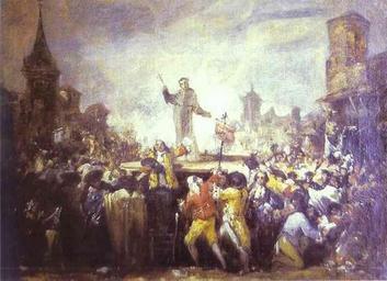 | Keywords: Esquilache riots.jpg Artwork Creator Francisco de Goya y Lucientes Motí d'Squillace segons Francisco de Goya 1766 Madrider Hutaufstand Madrider Hutaufstand von Francisco de Goya Motin de Esquilache by Francisco Goya The liberalization of the grain trade by Leopoldo de Gregorio marquis de Esquilache caused a sharp rise in grain prices and in turn riots The Esquilache Riots by Francisco de Goya 1766 La madrida ĉapelribelo Tumulto de Eskilaĉo de Francisco de Goya Motín de Esquilache atribuido a Francisco de Goya ca 1766 1767 colección privada París 1 La torre del Ayuntamiento a la izquierda permite situar la escena en la Puerta de Guadalajara calle Mayor 2 El fondo despejado de la calle marca la dirección hacia Palacio a donde los amotinados pretenden dirigirse El personaje con hábito y crucifijo que intenta calmar o coordinar a la multitud es el Padre Yecla o Padre Cuenca un fraile gilito orden franciscana de los que predicaban por las plazas En señal de penitencia llevaba la cabeza encenizada soga al cuello y corona de espinas 3 Un personaje subido en una silla gesticula ante la multitud Su vestidura una lujosa casaca le identifica como un personaje de alta posición social Varios personajes uno claramente vestido de manolo con redecilla recogiendo el pelo levantan un estandarte con una inscripción difícil de distinguir se han propuesto las lecturas Muera Esquilache y Muera el fantoche 4 Varios personajes a la izquierda van vestidos contra la ordenanza con chambergo y capa larga A la derecha un personaje arrodillado firma sobre las espaldas de otro la lista de peticiones que el fraile llevará hasta el rey El motín de Esquilache de Francisco de Goya Esquilacheren aurkako matxinada Francisco de Goya Motín de Esquilache de Francisco de Goya La révolte contre Esquilache par Francisco de Goya Motin de Esquilache di Francisco Goya La liberalizzazione del commercio del grano da parte di Leopoldo de Gregorio Marchese di Esquilache causò un netto rialzo dei prezzi del grano e di conseguenza delle rivolte Motin de Esquilache 프 스코 고야 곡물 무역 자 화되면 곡물 는 급등했고 는 민들 폭동 어졌다 Fra opptøyene i Madrid i 1766 Frihandelen hadde sørget for en stor økning i kornprisene noe som førte til at kongen ble jaget fra byen Maleri av Francisco Goya Motín de Esquilache malował Francisco Goya ca 1766 1767 object history exhibition history credit line accession number unknown PD-old-100 ImageNote 1 342 148 42 37 759 551 2 El predicador que intenta calmar o coordinar a la multitud exhibiendo un crucifijo es el Padre Yecla o Padre Cuenca un fraile gilito orden franciscana de los que habitualmente predicaban por las plazas Como penitencia llevaba la cabeza llena de ceniza una corona de espinas y una soga al cuello ImageNoteEnd 1 ImageNote 2 561 385 144 99 759 551 2 Las peticiones de los amotinados fueron llevadas al rey por el predicador y antes fueron firmadas por muchos de los asistentes utilizando como soporte las espaldas de unos para que otros firmaran ImageNoteEnd 2 ImageNote 3 118 332 161 111 759 551 2 Varios personajes van vestidos con la capa larga y el sombrero de ala ancha chambergo en claro desafío de la ordenanza de Esquilache ImageNoteEnd 3 ImageNote 4 412 225 64 72 759 551 2 Estandarte con la inscripción de difícil lectura Muera Esquilache o bien Muera el fantoche ImageNoteEnd 4 ImageNote 5 41 6 83 219 759 551 2 Una de las torres del Ayuntamiento de Madrid permite identificar el lugar en que se desarrolla la escena la Puerta de Guadalajara calle Mayor ImageNoteEnd 5 ImageNote 6 287 271 88 59 759 551 2 El personaje que gesticula subido en una silla aparece vestido con una lujosa casaca indicando su alta posición social ImageNoteEnd 6 ImageNote 7 359 341 69 151 759 551 2 Uno de los que llevan el estandarte va redecilla al pelo y las típicas vestiduras de manolo el prototipo chulesco de las clases populares madrileñas ImageNoteEnd 7 Motín de Esquilache Enlightenment in Spain Paintings from Spain 18th-century paintings Cities of Spain in art Paintings by Francisco de Goya Plaza de Antón Martín Paintings in private collections |