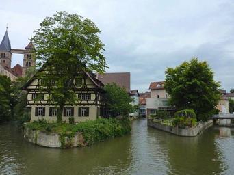 Keywords: esslingen germany sky clouds buildings stream water reflections trees scenic outside city cities urban summer spring