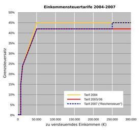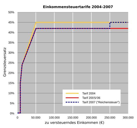 | Keywords: ESt-Tarife04-07-v3.svg Einkommensteuertarife Deutschland 2004-2007 Selbst erstellt mit Informationen des BMJ und BMF 2006-06-15 cktu de Reichensteuer cktu Reworked version of de Image ESt-Tarife04-07-v2 svg by Sioux and xavax Tax in Germany |