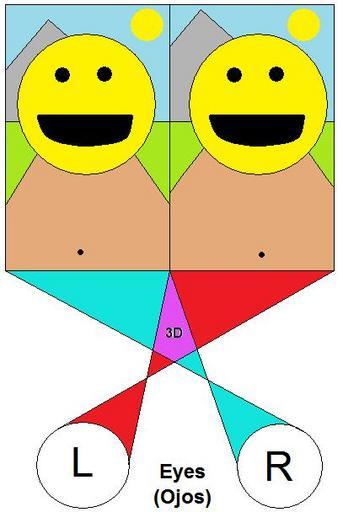 | Keywords: Estereoglifo.jpg es Aqui vemos como al cruzar los ojos es percibido el efecto 3D En esta imagen se muestra cómo al cruzar los ojos se puede lograr el efecto 3D debido a que con este método cada ojo percibe solo una imagen La imagen correspondiente a cada ojo es la contraria al ojo con el que se mira es decir el ojo izquierdo ve la imagen de la derecha y el ojo derecho ve la imagen de la izquierda en Here we see how the 3D effect is perceived when the eyes are crossed This image shows how to cross your eyes you can achieve the 3D effect because with this method each eye sees only one image the corresponding image to each eye is contrary to eye with the beholder ie the left eye sees the right image and the right eye sees the left image own Kyro142 2011-04-29 Cc-zero Crosseye-view stereo images Autostereogram tutorial English text Spanish text |