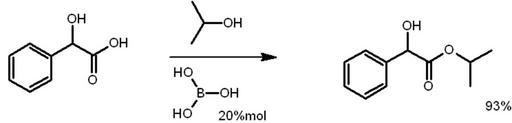| Keywords: Estryfikacja.png en Reaction of esterification of mandelic acid catalysed by boric acid to form Isopropyl Mandelate pl Reakcja esteryfikacji kwasu migdałowego izopropanolem katalizowana kwasem borowym z utworzeniem migdalanu izopropylu own Moja praca / own work Filips Filip Stefaniak Cc-zero Esterification |